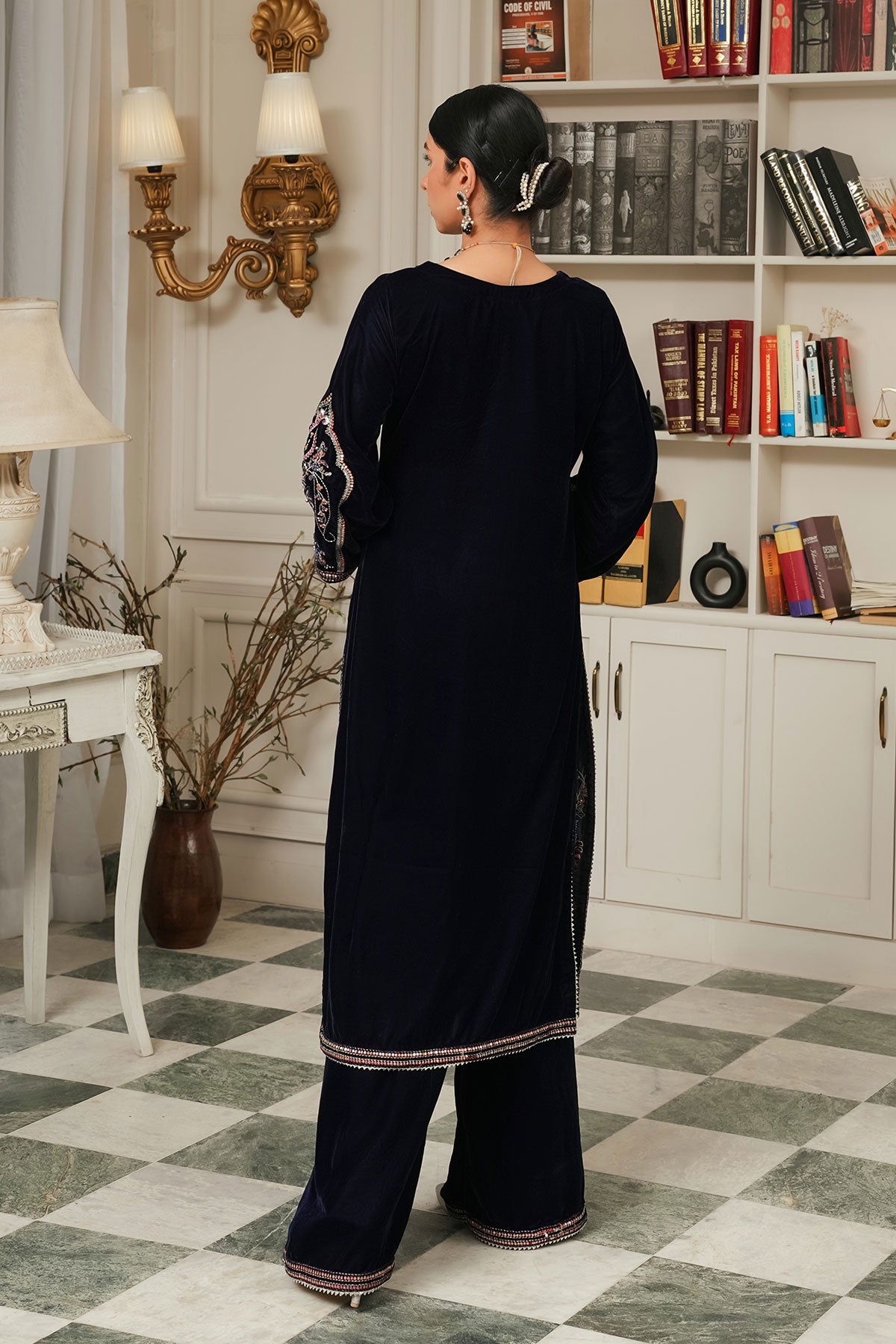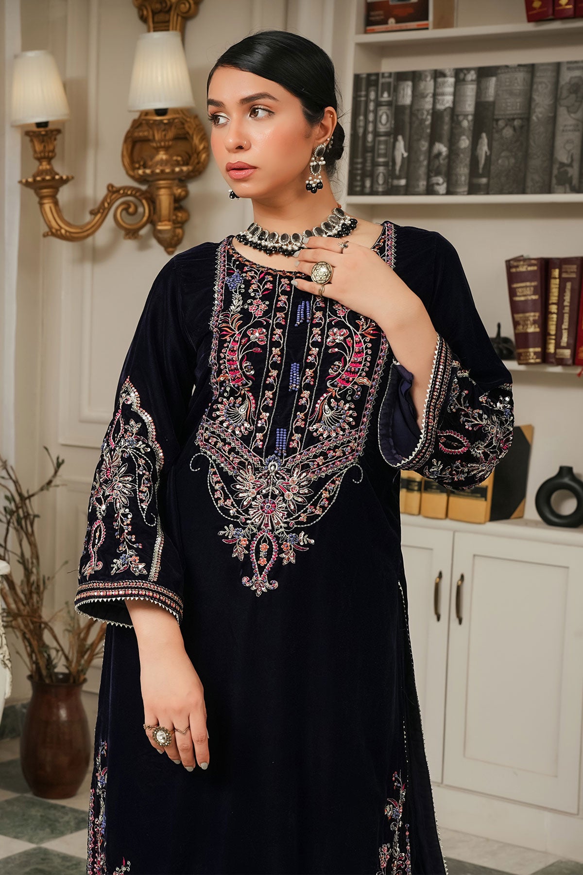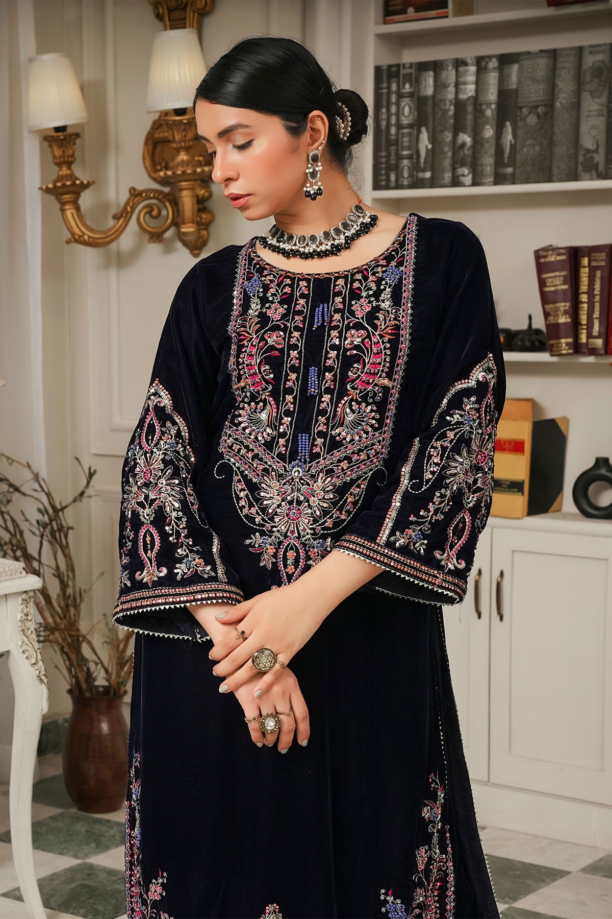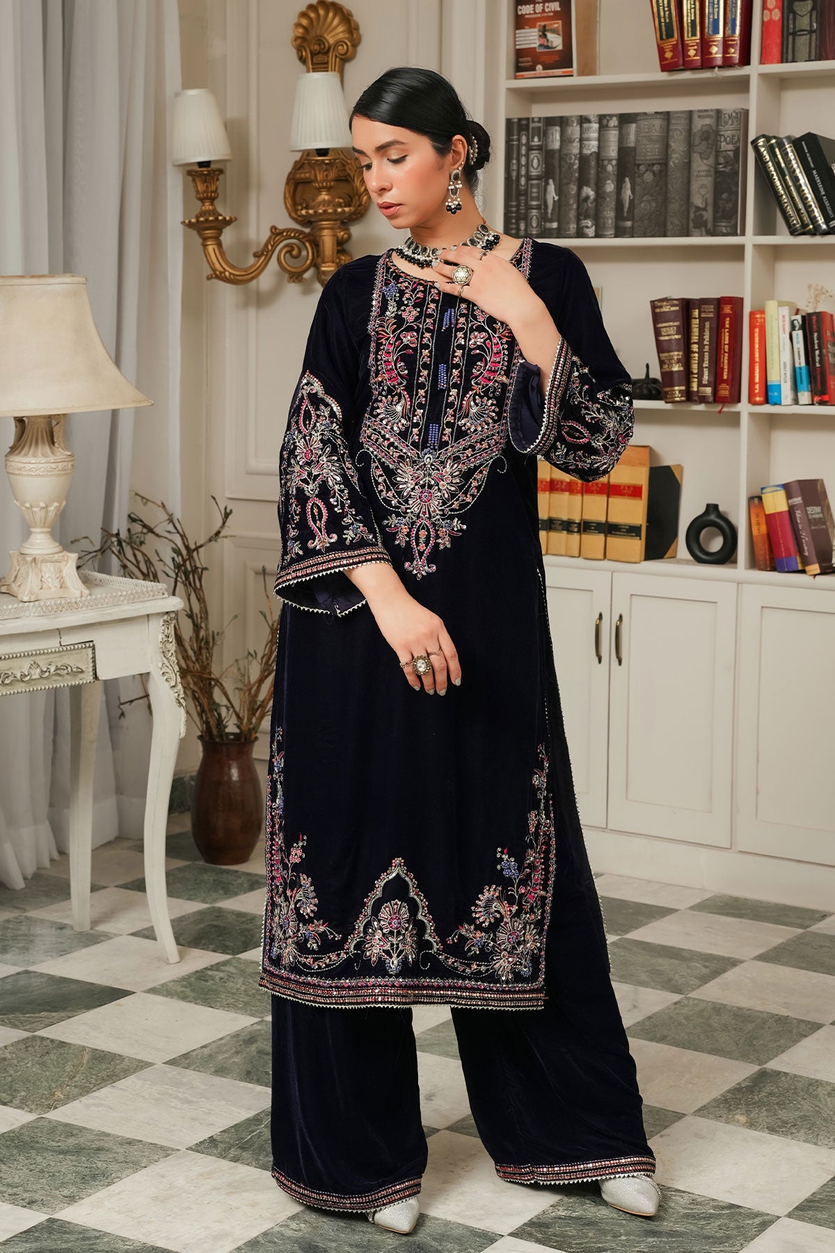 Showcases exquisite embroidery on the front and sleeves of a luxurious velvet fabric. Finished with delicate handmade neckline and lace detailing, this ready-to-wear winter outfit combines elegance and warmth. Complemented by a flowing chiffon dupatta and rich velvet trousers, it offers both comfort and style for the colder season. Perfect for festive occasions or refined everyday wear.