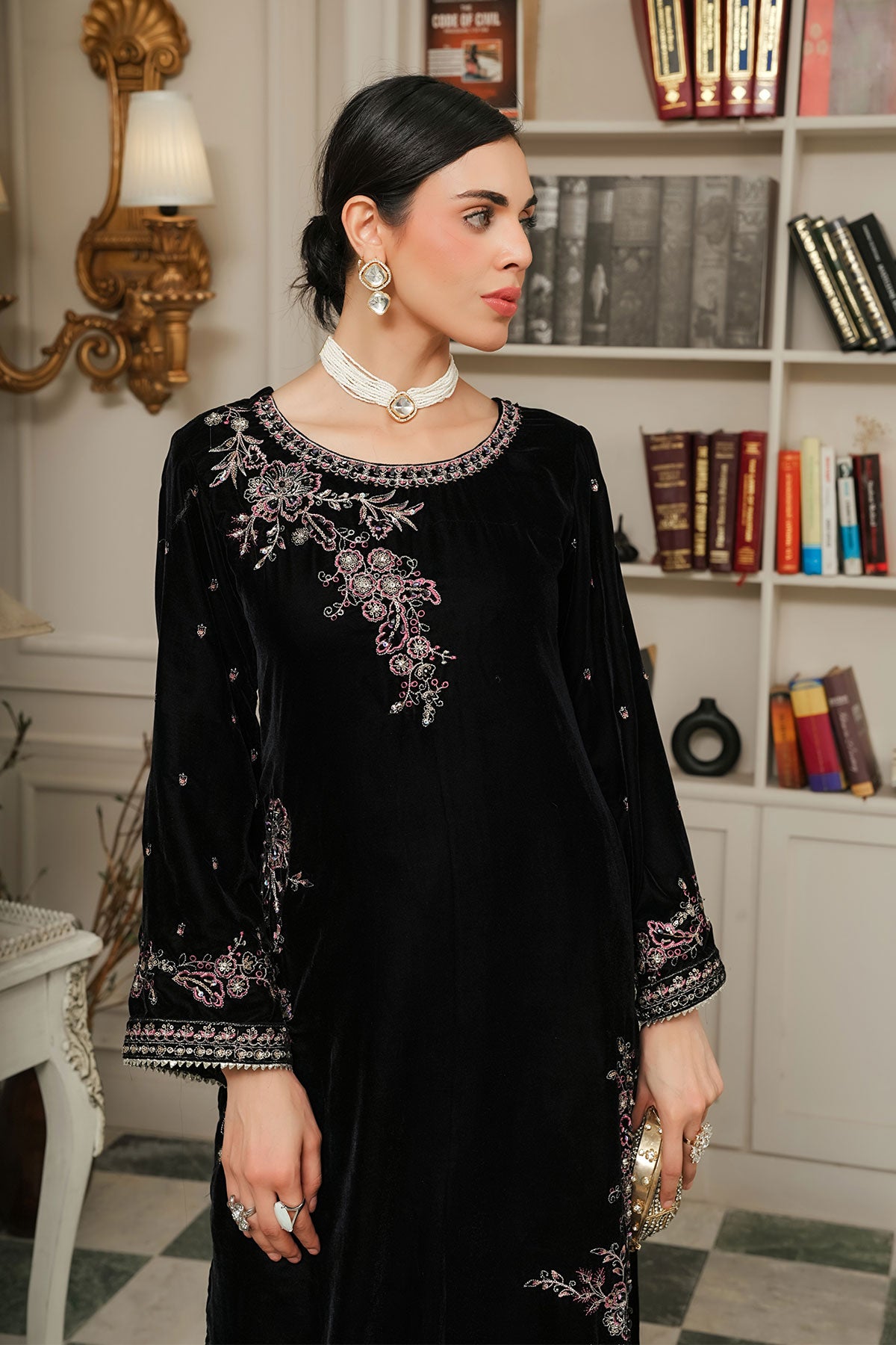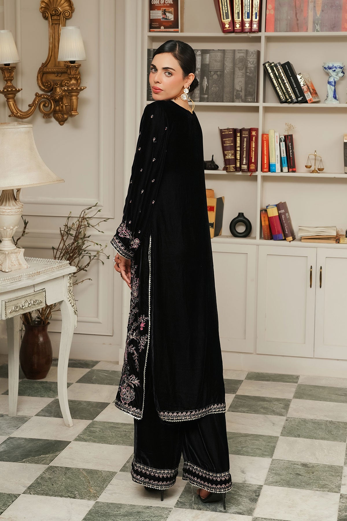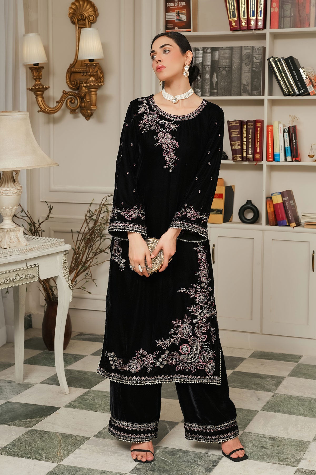This winter-ready ensemble features a velvet outfit with intricate embroidered work on the front and sleeves, enhanced by delicate handmade lace details. The velvet trousers complement the luxurious top, while the chiffon dupatta, finished with lace work, adds an elegant touch. Designed for warmth and style, this set offers a comfortable yet sophisticated look for the colder season.