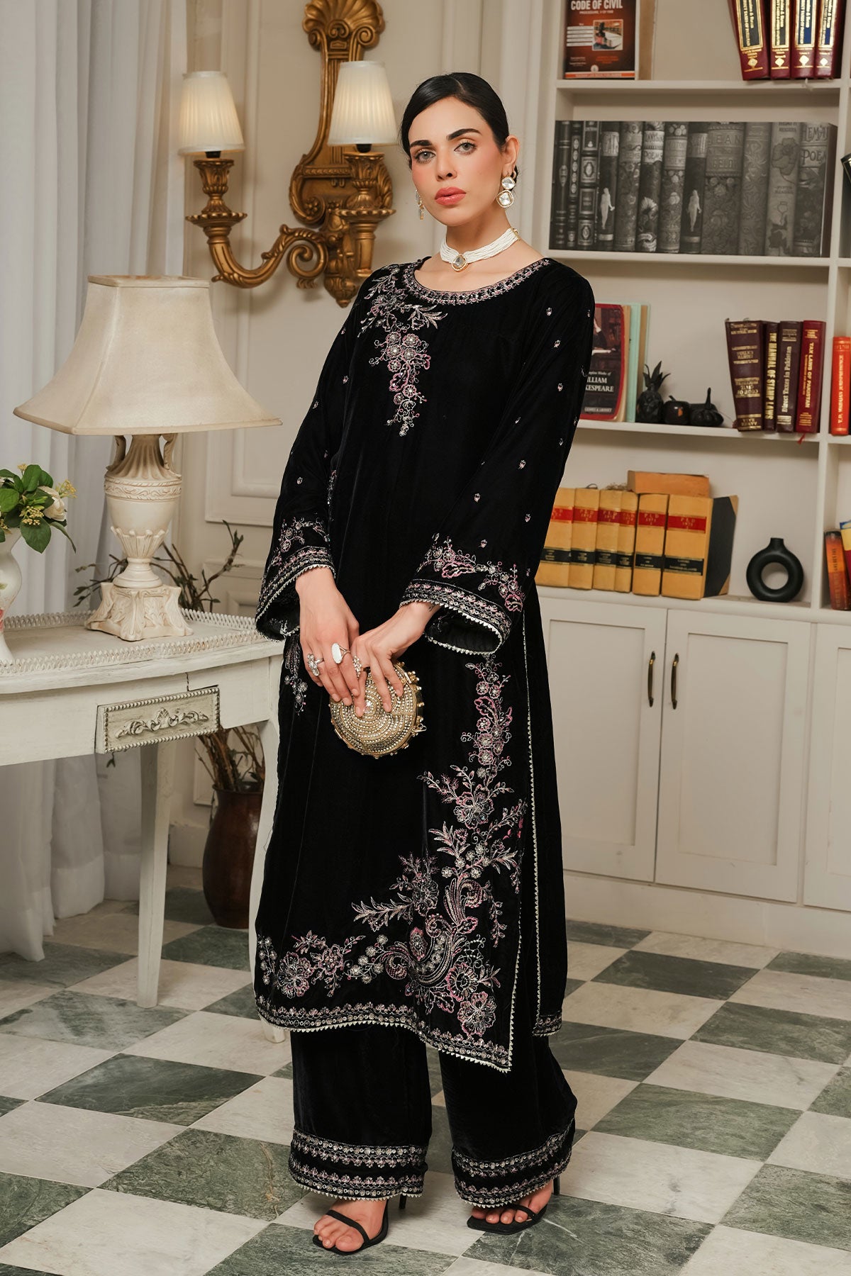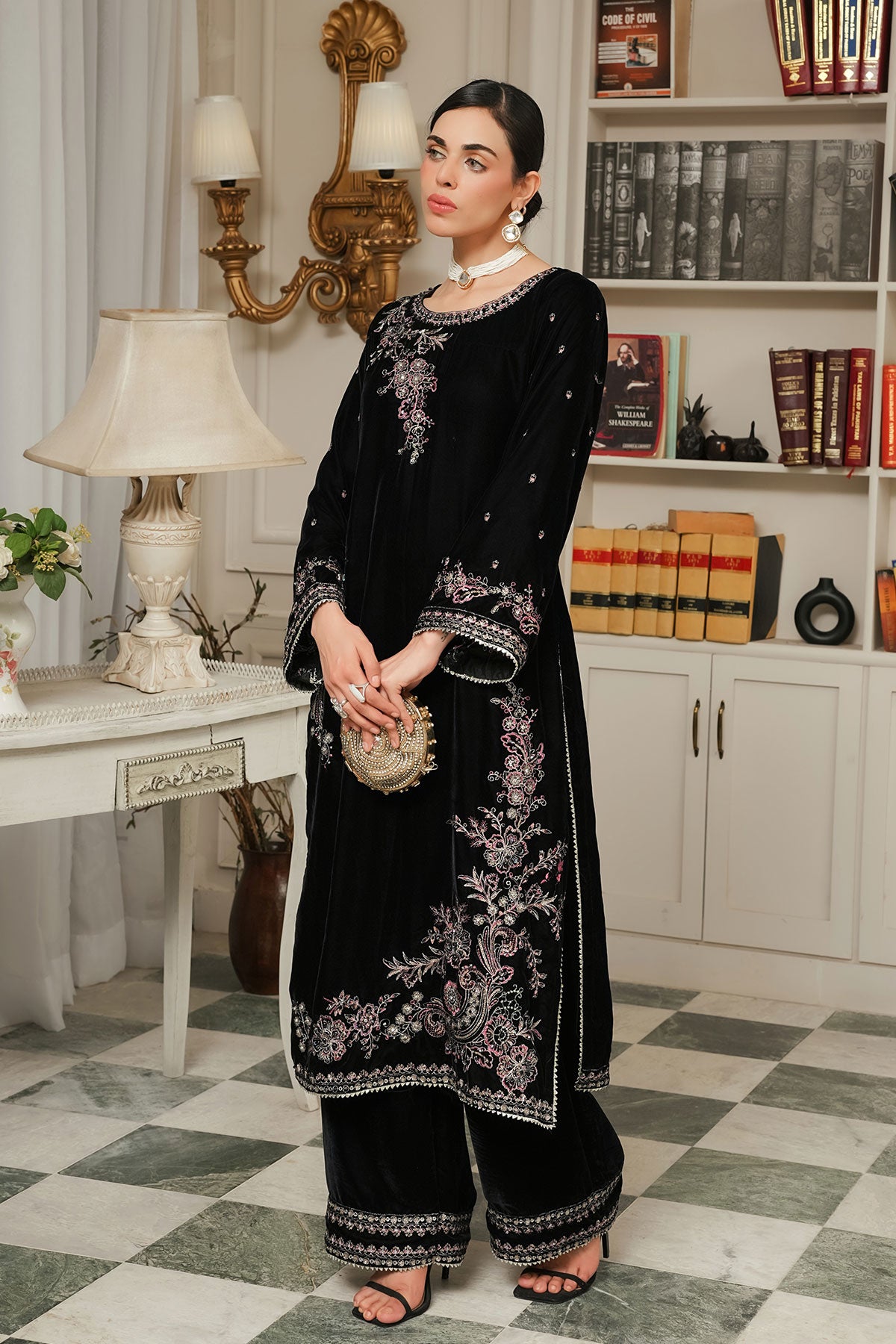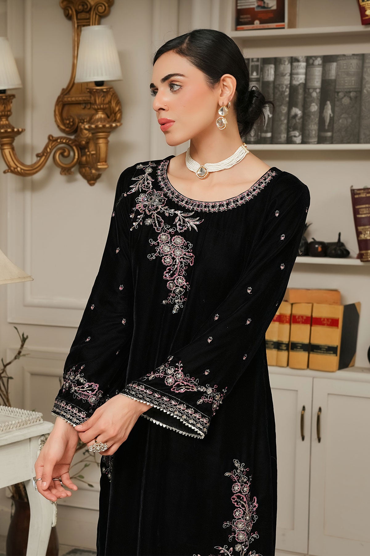 This winter-ready ensemble features a velvet outfit with intricate embroidered work on the front and sleeves, enhanced by delicate handmade lace details. The velvet trousers complement the luxurious top, while the chiffon dupatta, finished with lace work, adds an elegant touch. Designed for warmth and style, this set offers a comfortable yet sophisticated look for the colder season.