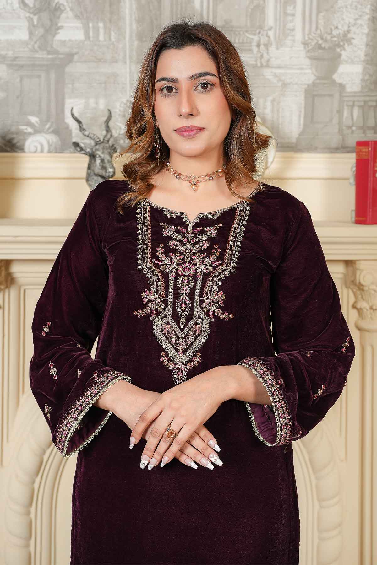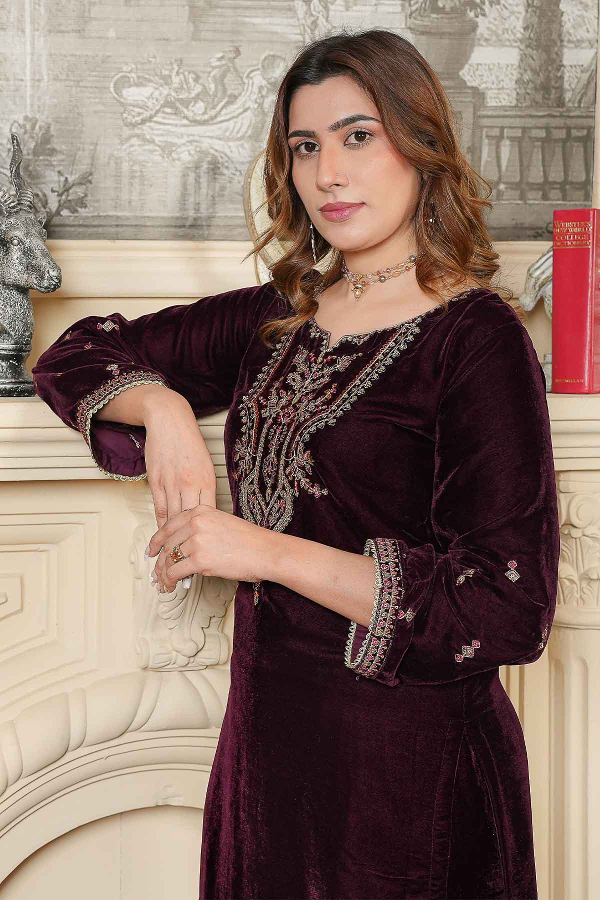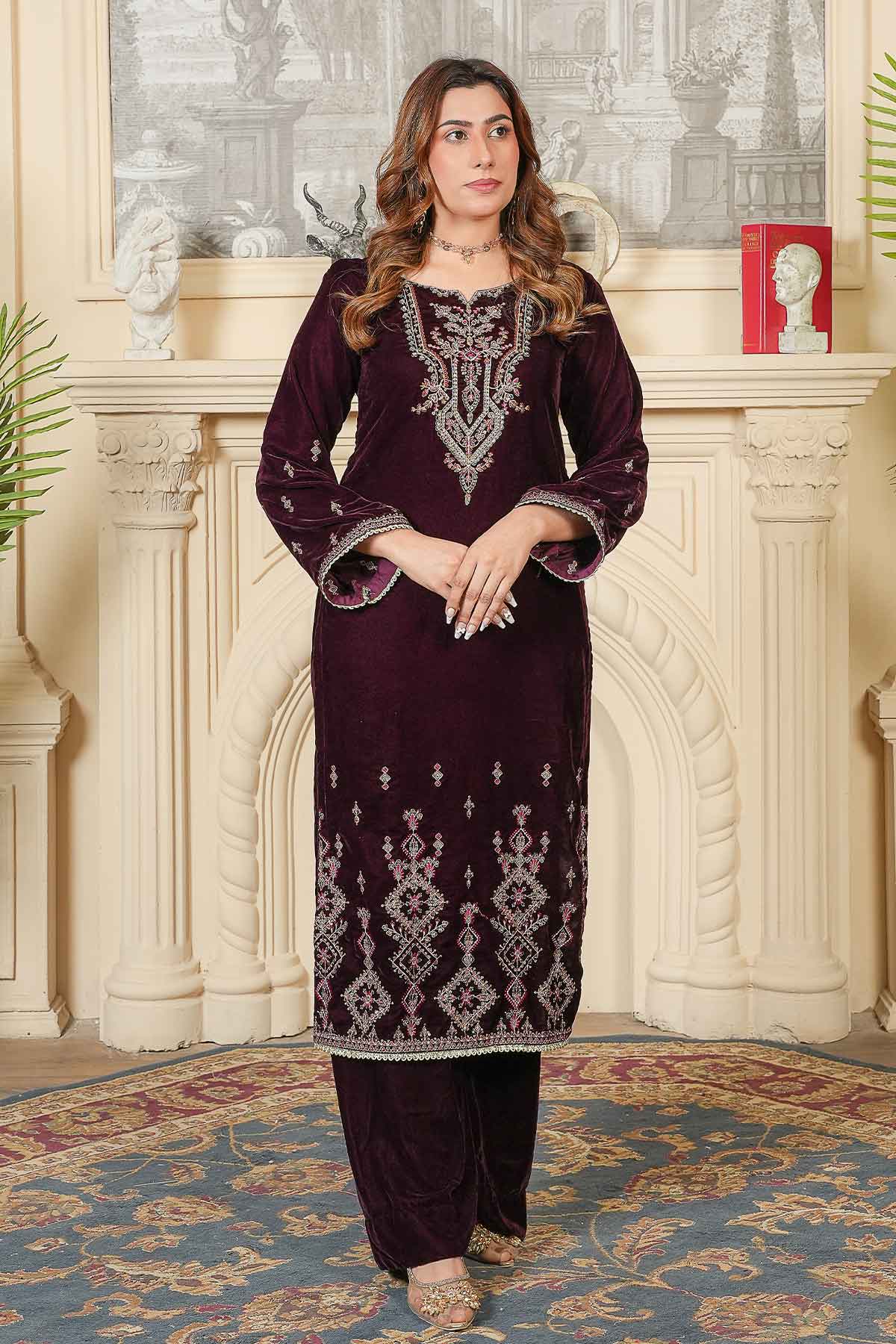 Elevate your winter wardrobe with this stunning three-piece ensemble designed for effortless elegance. The velvet front piece features intricate embroidery paired with delicate lace detailing, creating a sophisticated focal point. Paired with a plain chiffon dupatta finished in matching lace work for added grace, and comfortable plain velvet trousers that complete the look. This ready-to-wear collection piece brings together traditional craftsmanship and modern comfort, perfect for any occasion this season.