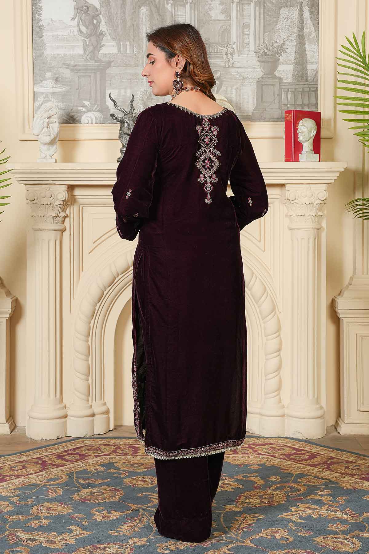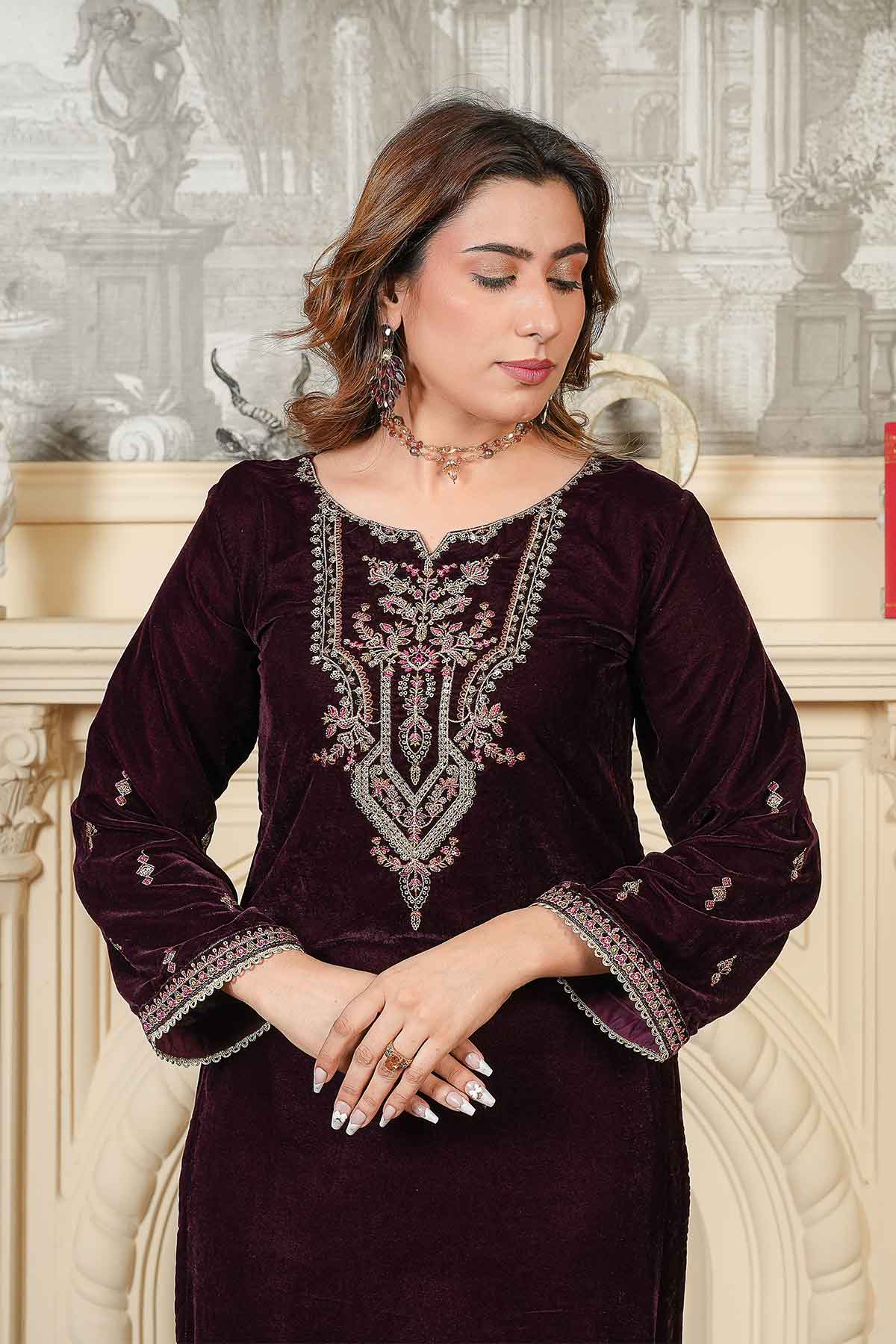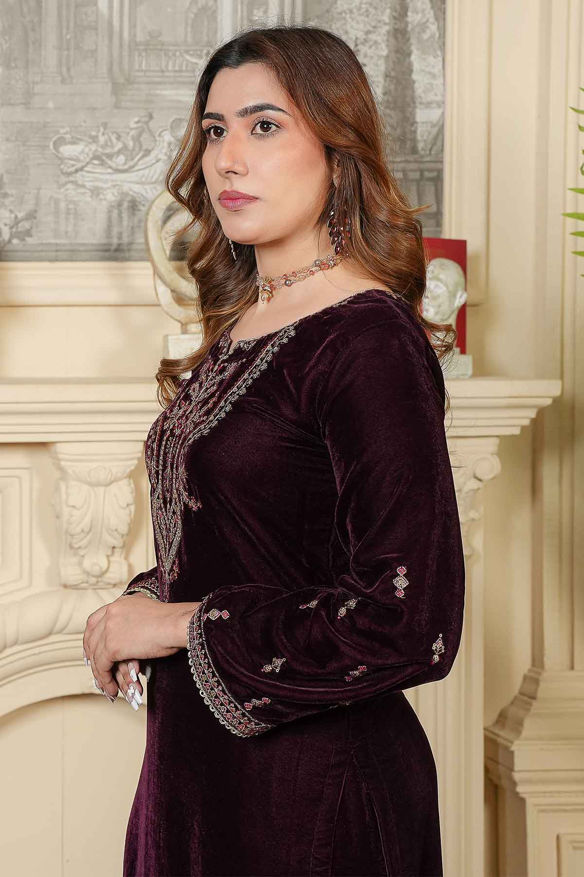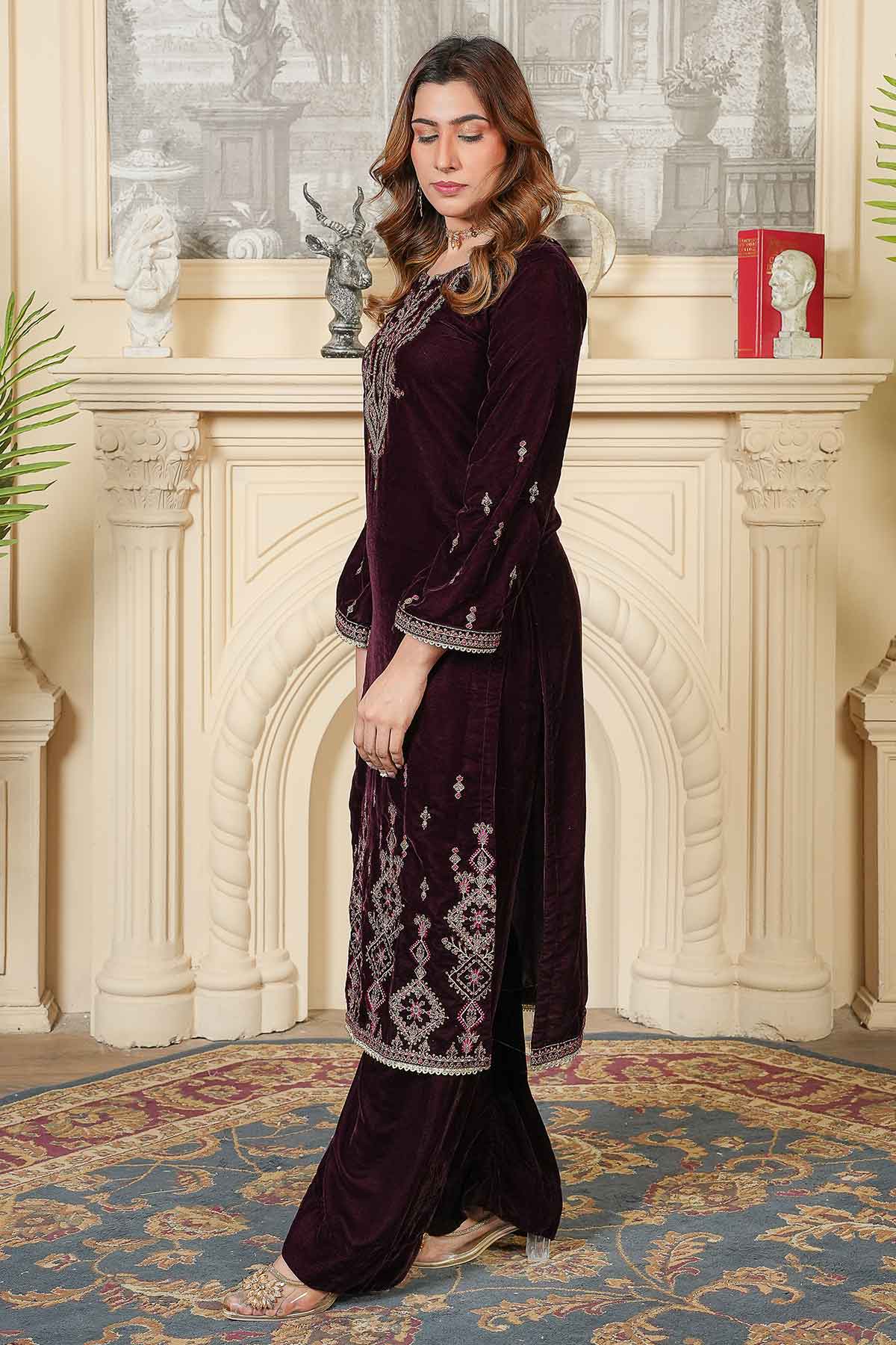 Elevate your winter wardrobe with this stunning three-piece ensemble designed for effortless elegance. The velvet front piece features intricate embroidery paired with delicate lace detailing, creating a sophisticated focal point. Paired with a plain chiffon dupatta finished in matching lace work for added grace, and comfortable plain velvet trousers that complete the look. This ready-to-wear collection piece brings together traditional craftsmanship and modern comfort, perfect for any occasion this season.