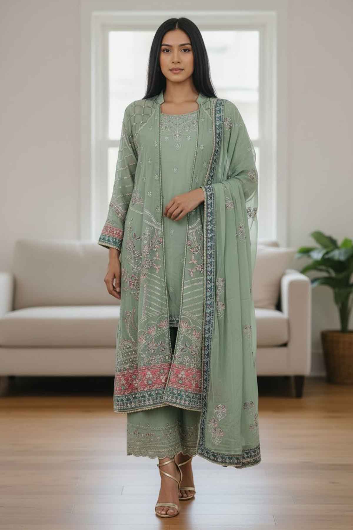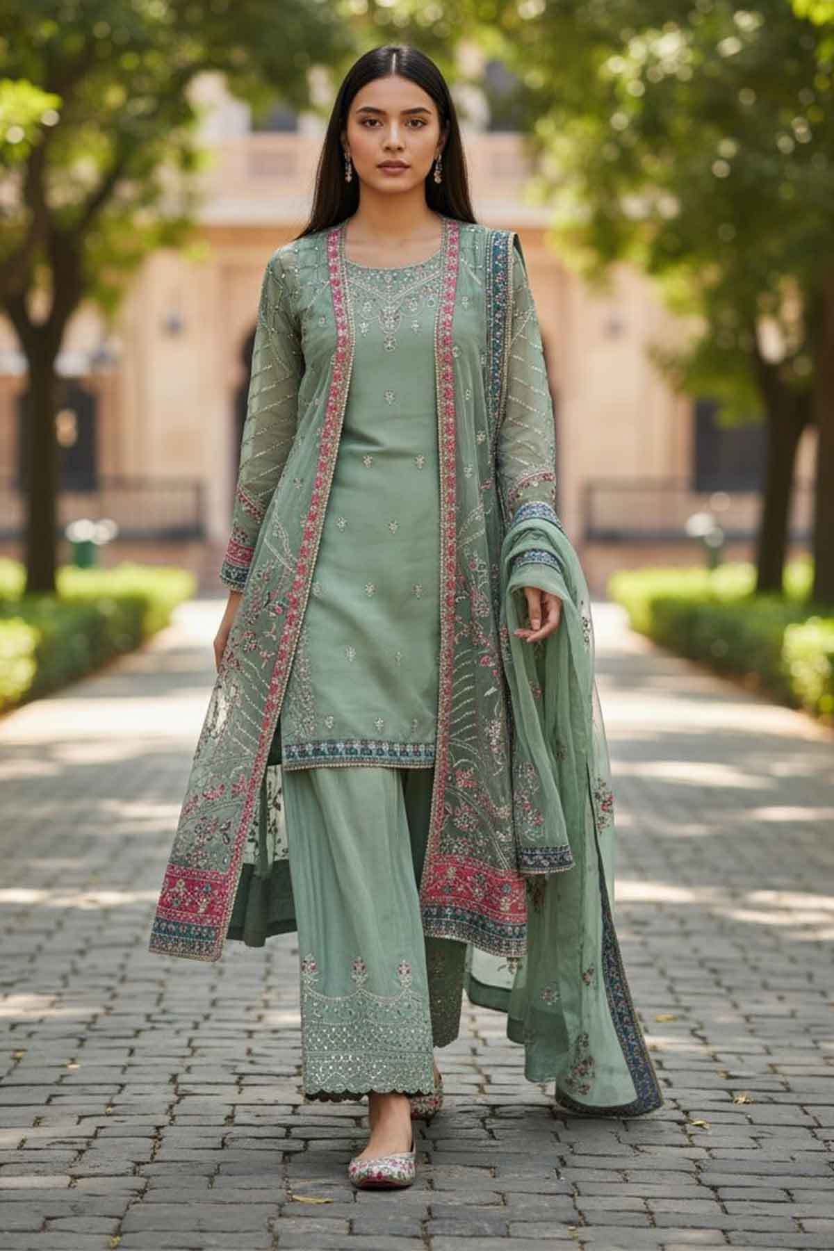 Elevate your wardrobe with this stunning ensemble that celebrates timeless elegance. The intricately embroidered front and back gown features luxurious chiffon fabric adorned with exquisite stone work and delicate lace detailing. Paired with a beautifully embroidered grip shirt that ensures comfort and style, this collection includes a matching embroidered chiffon dupatta finished with graceful lace work. Complete the look with the embroidered grip sharara for a cohesive, sophisticated appearance perfect for celebrations and special occasions.