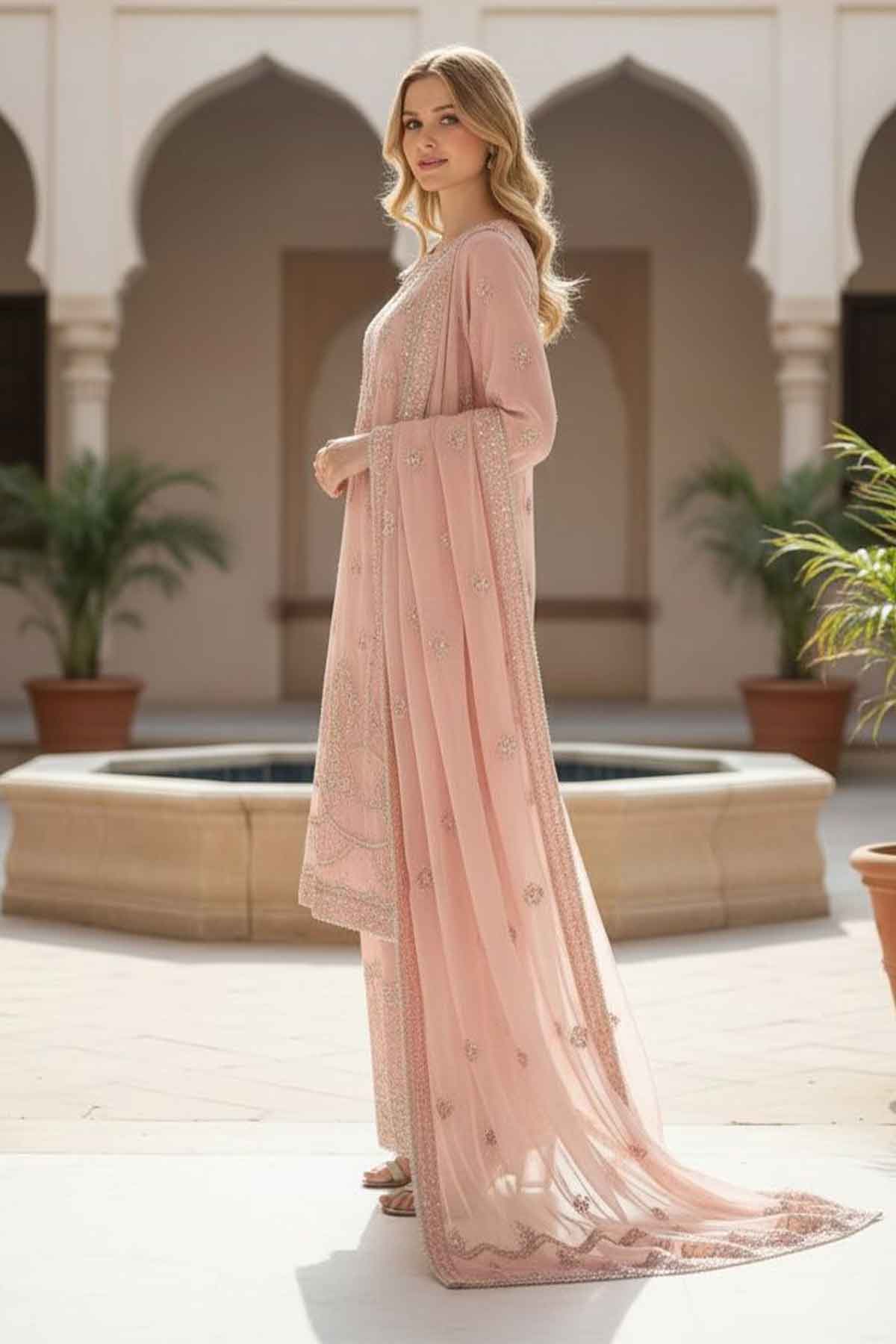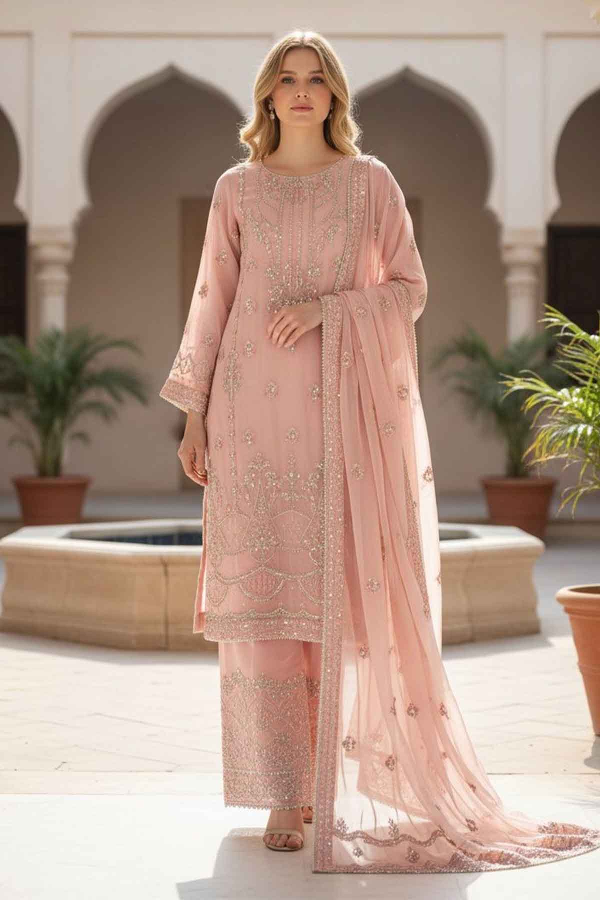 Elevate your wardrobe with this stunning three-piece ensemble that celebrates timeless elegance. The shirt features intricate embroidery adorning the front, back, and sleeves on luxurious chiffon, beautifully complemented by delicate stone work and lace detailing. The matching chiffon dupatta is finished with refined lace work, adding grace to every movement. Complete the look with the plain grip sharara for a polished silhouette. Perfect for celebrations, gatherings, or whenever you want to feel absolutely radiant in traditional style.