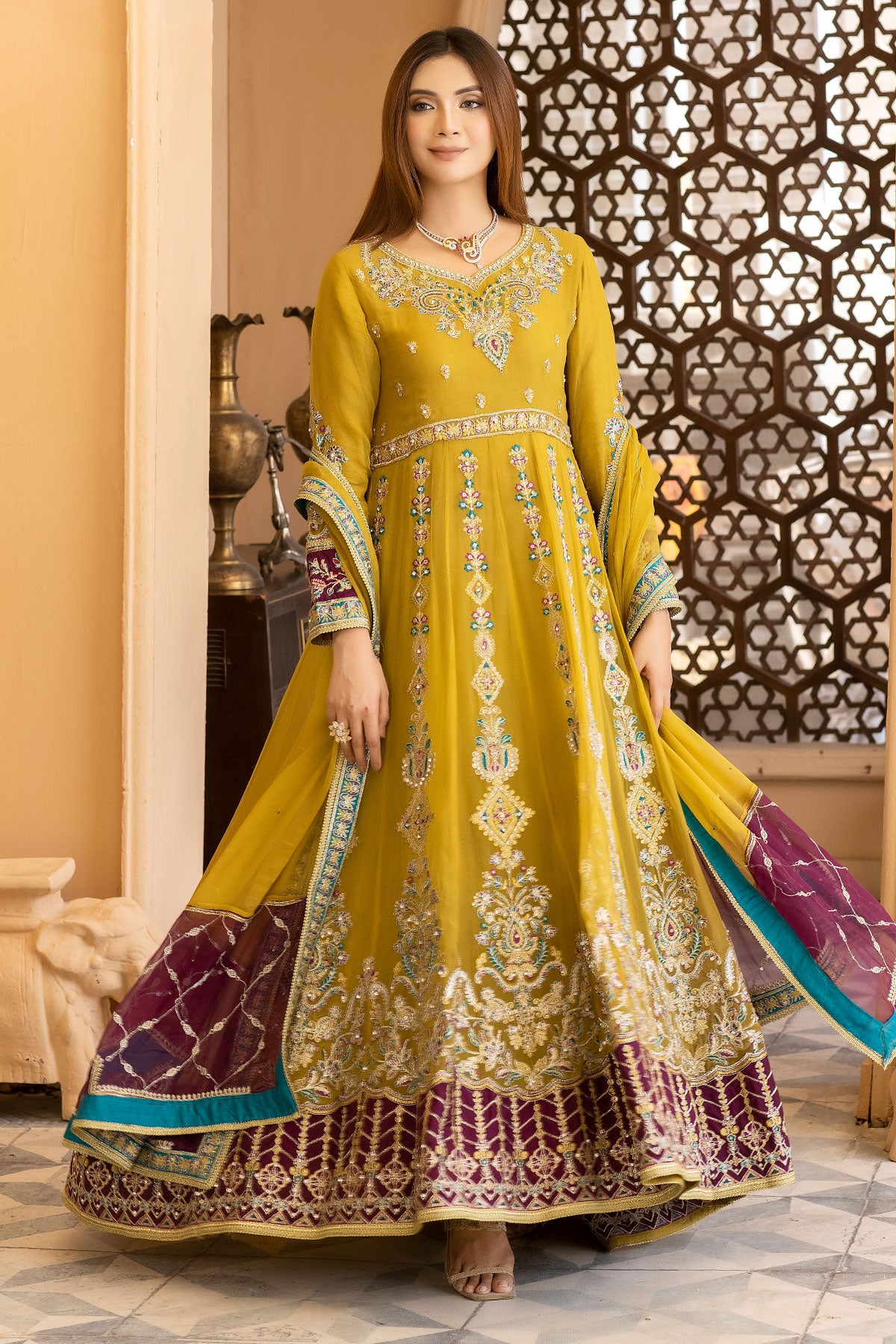 Make a statement in our beautiful maxi style dress. Expertly embroidered on chiffon and finished with intricate stone work and fancy lace, this wedding wear is truly special. The embroidered section dupatta adds a unique touch to the look. Complete with plain viscose trousers, this outfit is chic and timeless!