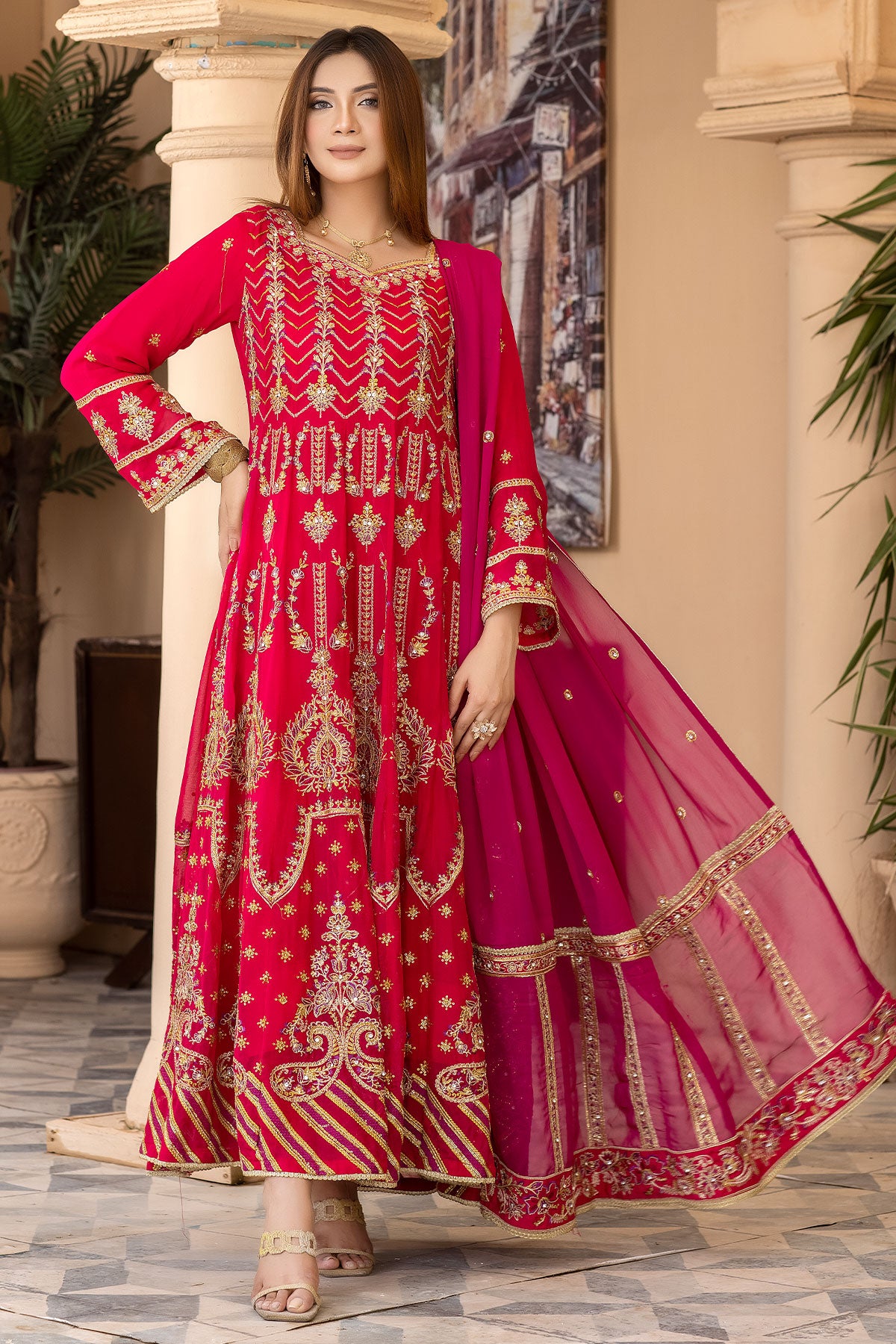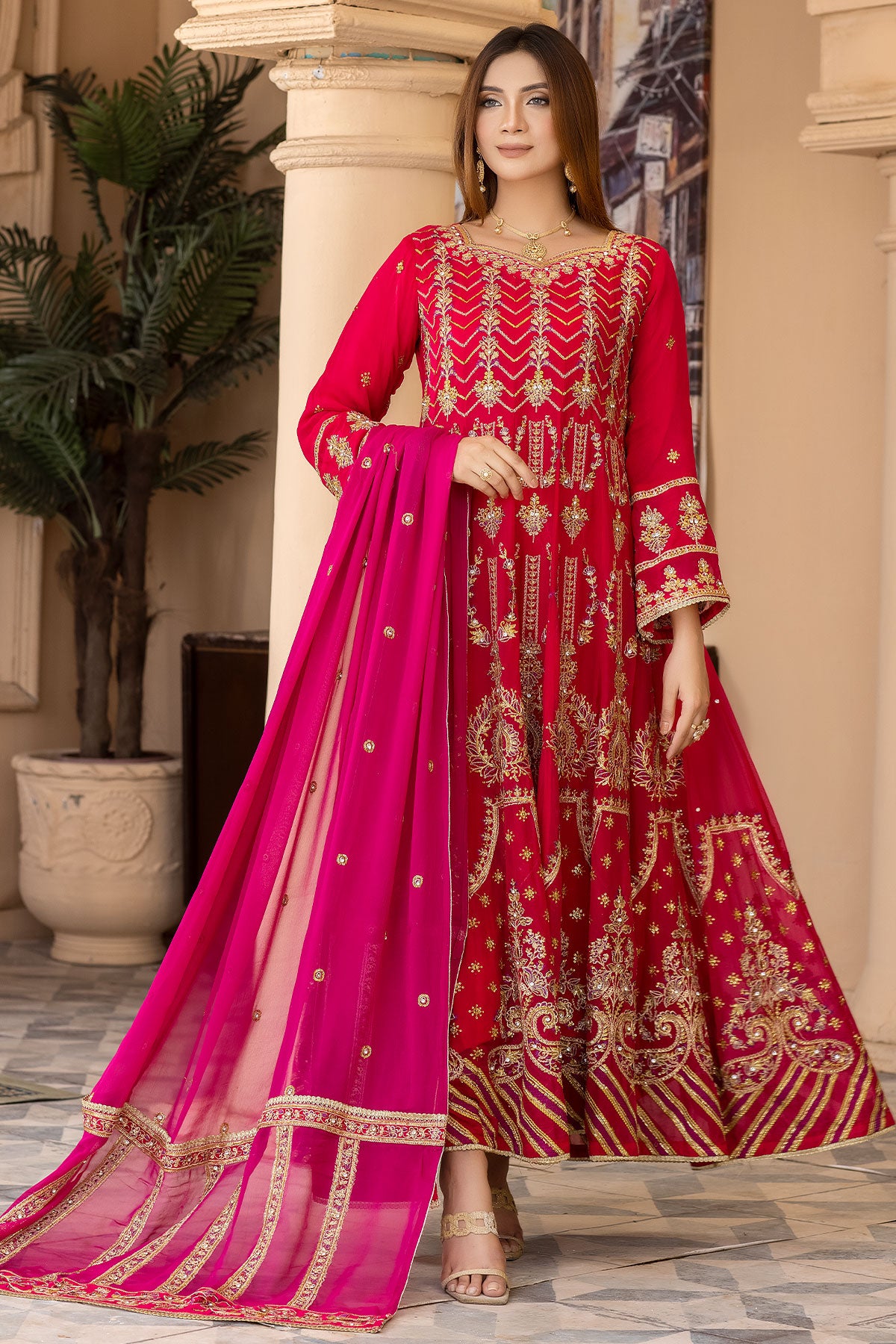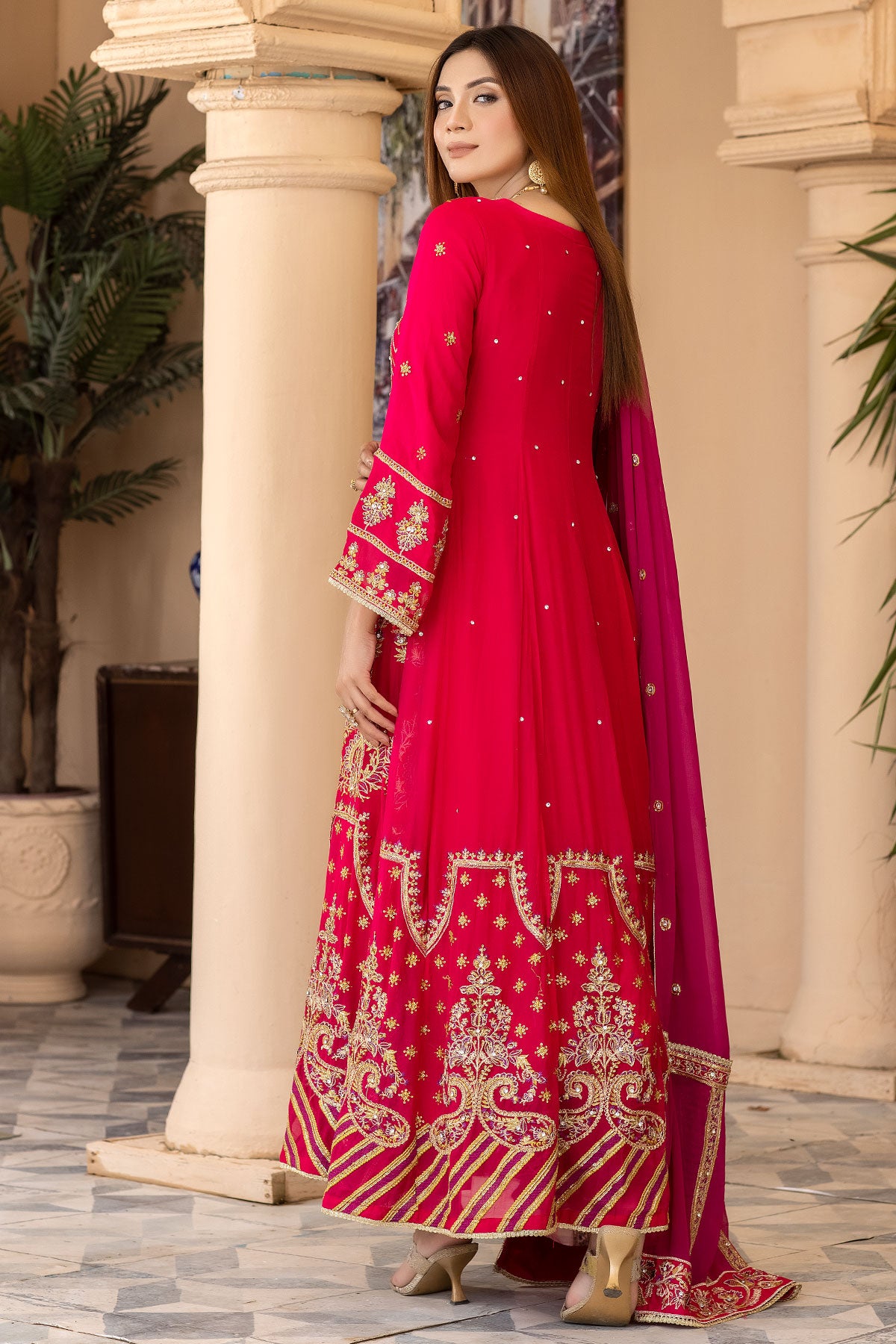 Take your special day to the next level with this maxi-style wedding wear. The beautiful embroidered chiffon and embellishments ensure you'll look stunning on the big day. Enjoy the comfort of the plain viscose trouser and the dazzling embroidered contrast chiffon dupatta. Get ready to make heads turn with RN-26!