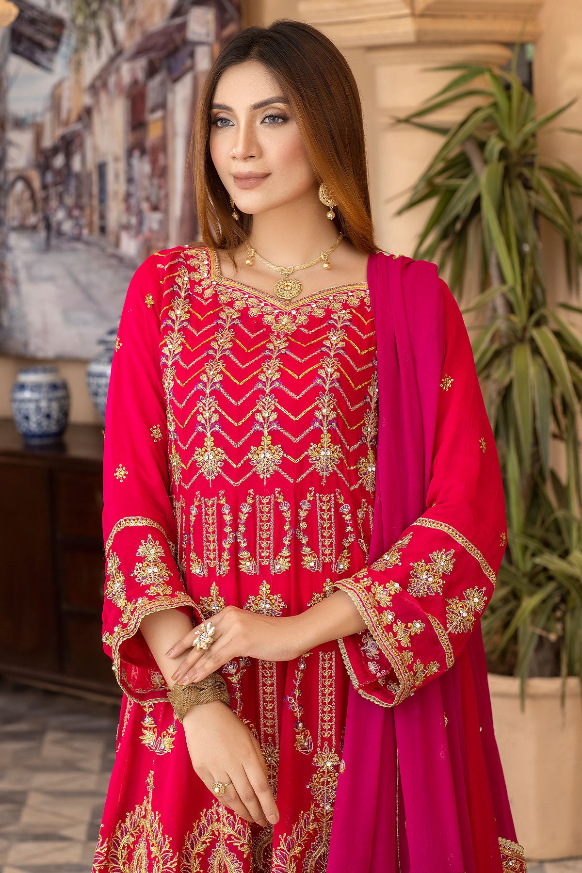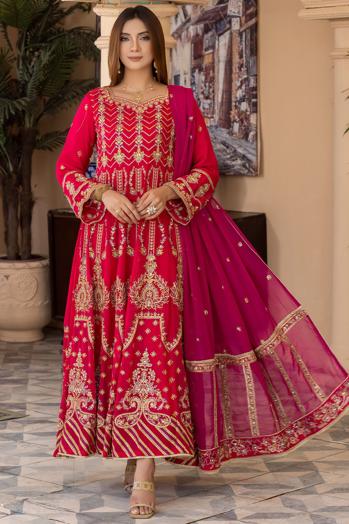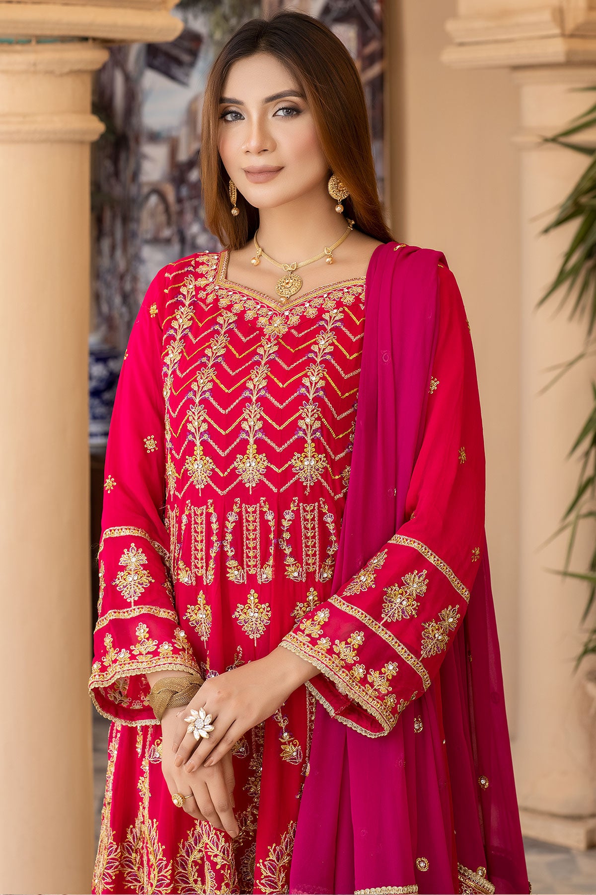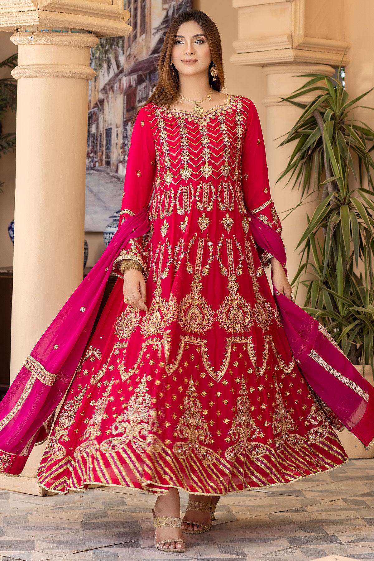 Take your special day to the next level with this maxi-style wedding wear. The beautiful embroidered chiffon and embellishments ensure you'll look stunning on the big day. Enjoy the comfort of the plain viscose trouser and the dazzling embroidered contrast chiffon dupatta. Get ready to make heads turn with RN-26!