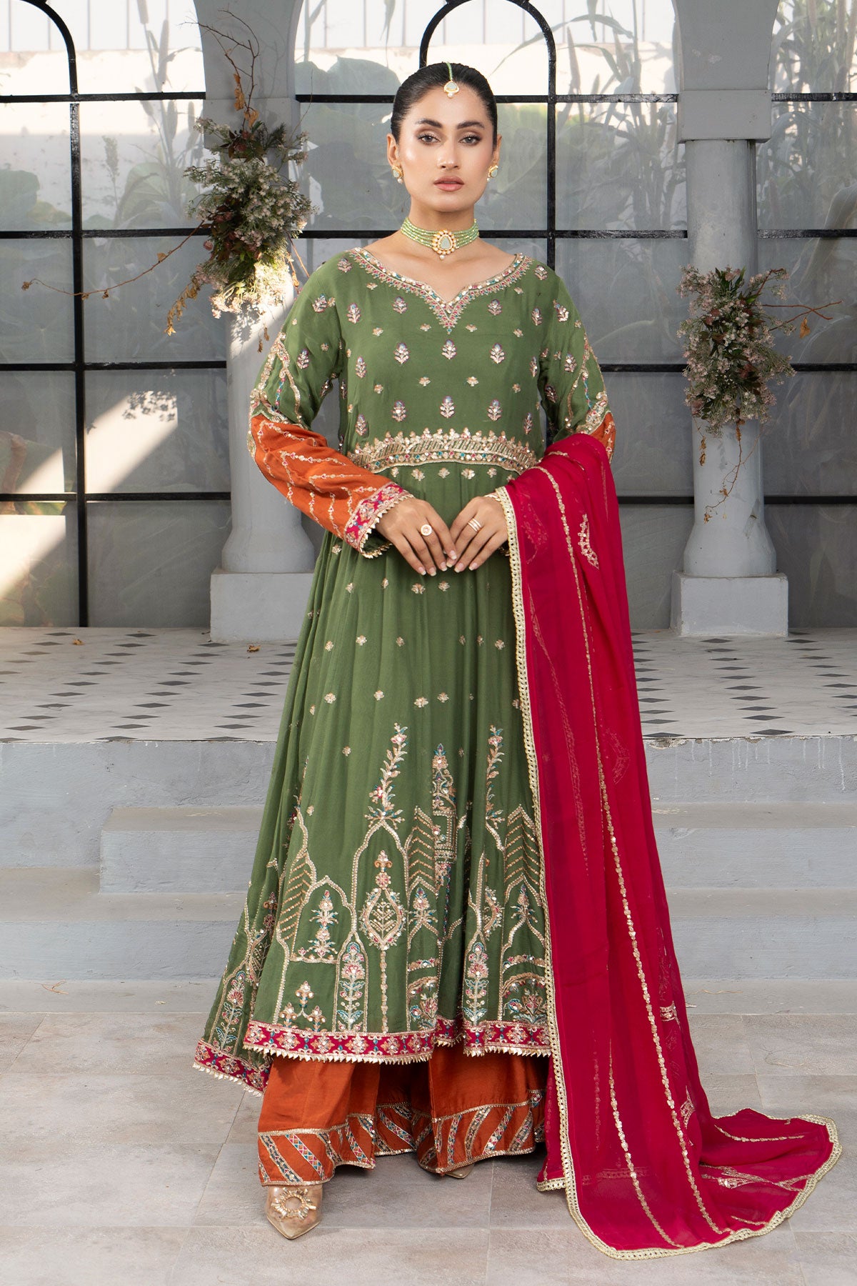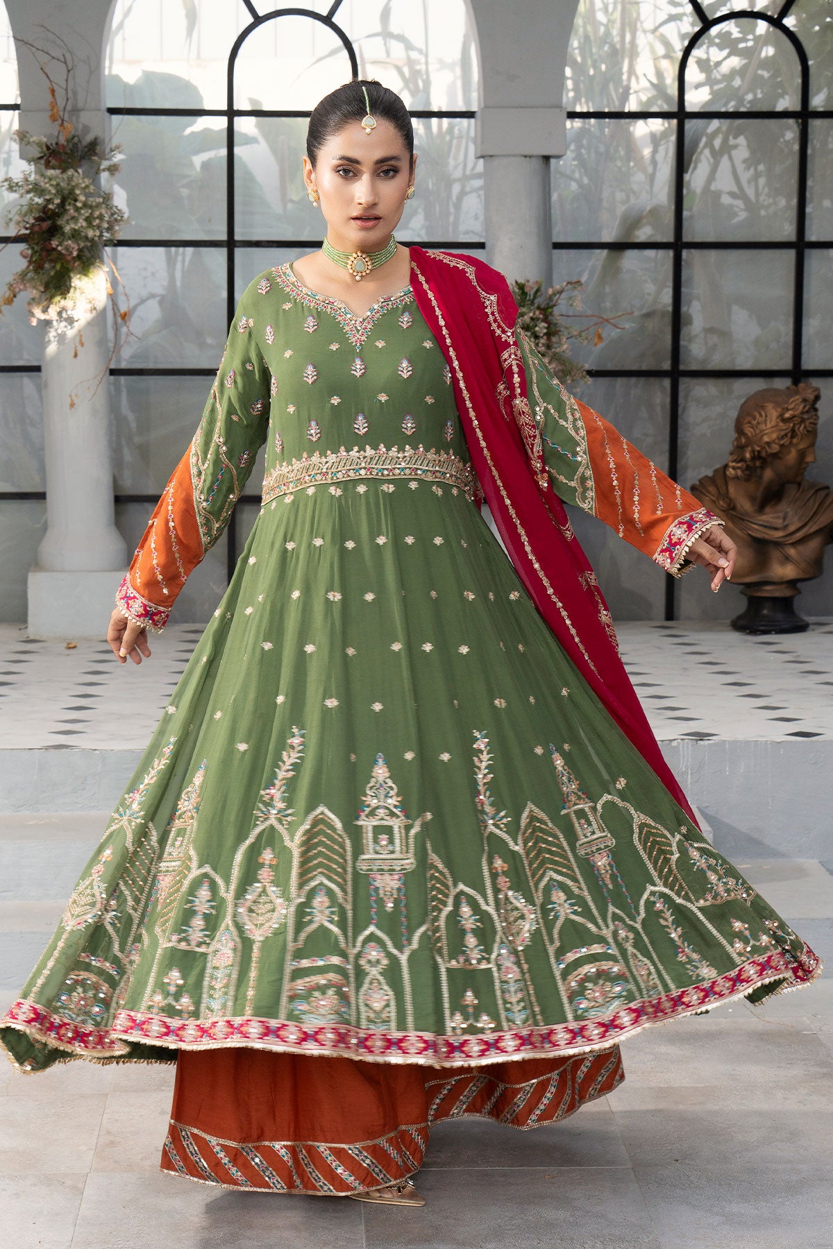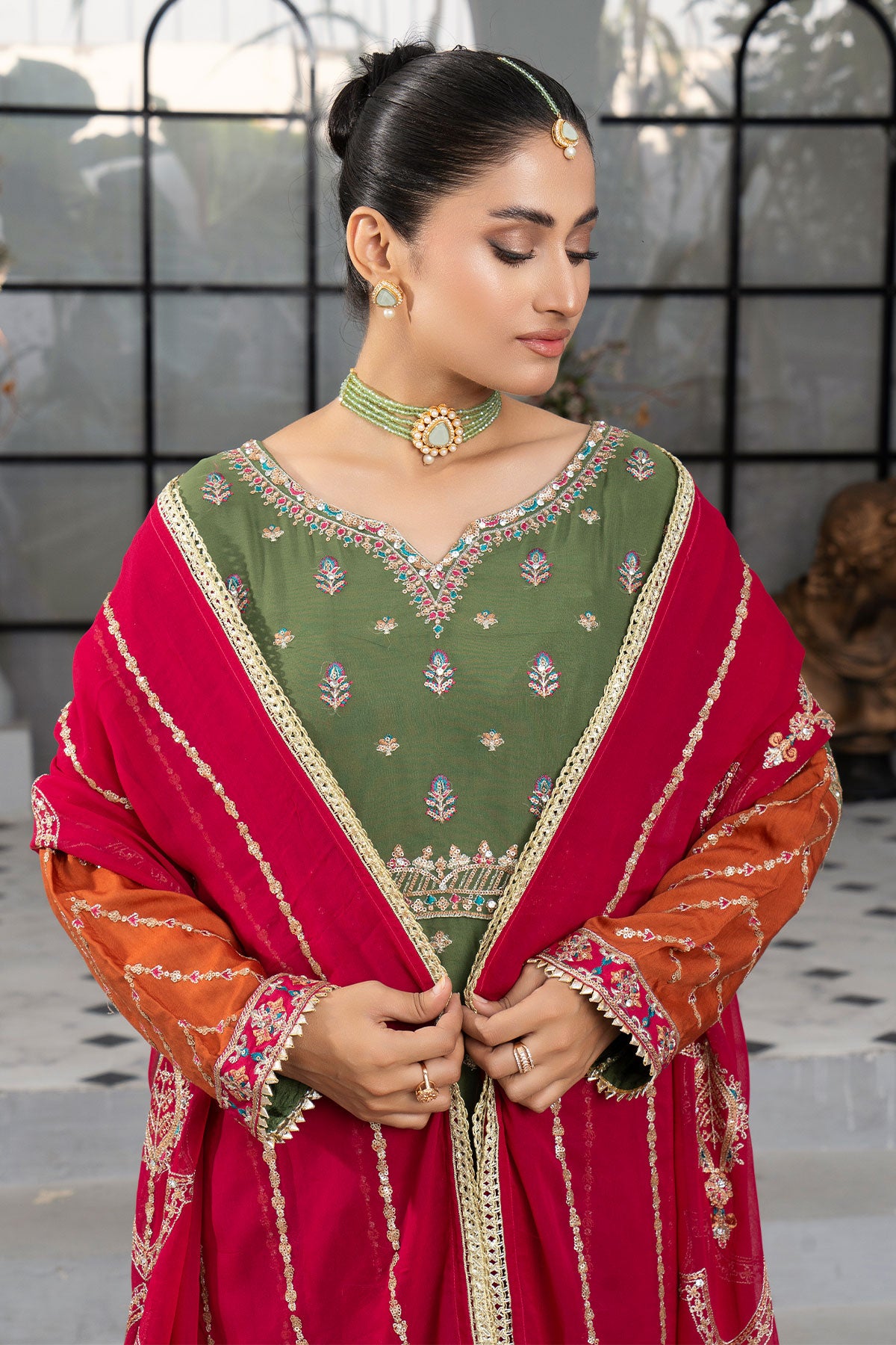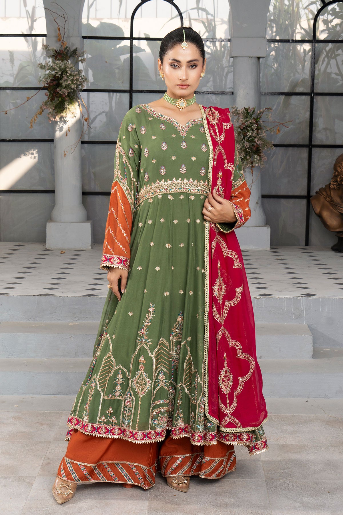 Elevate your wedding look with RN-47! This ready-to-wear outfit features embroidered chiffon with delicate stone work and lace, while the contrast chiffon dupatta adds an extra touch of elegance. The embroidered sleeves and sharara bring a beautiful contrast to complete your special day.