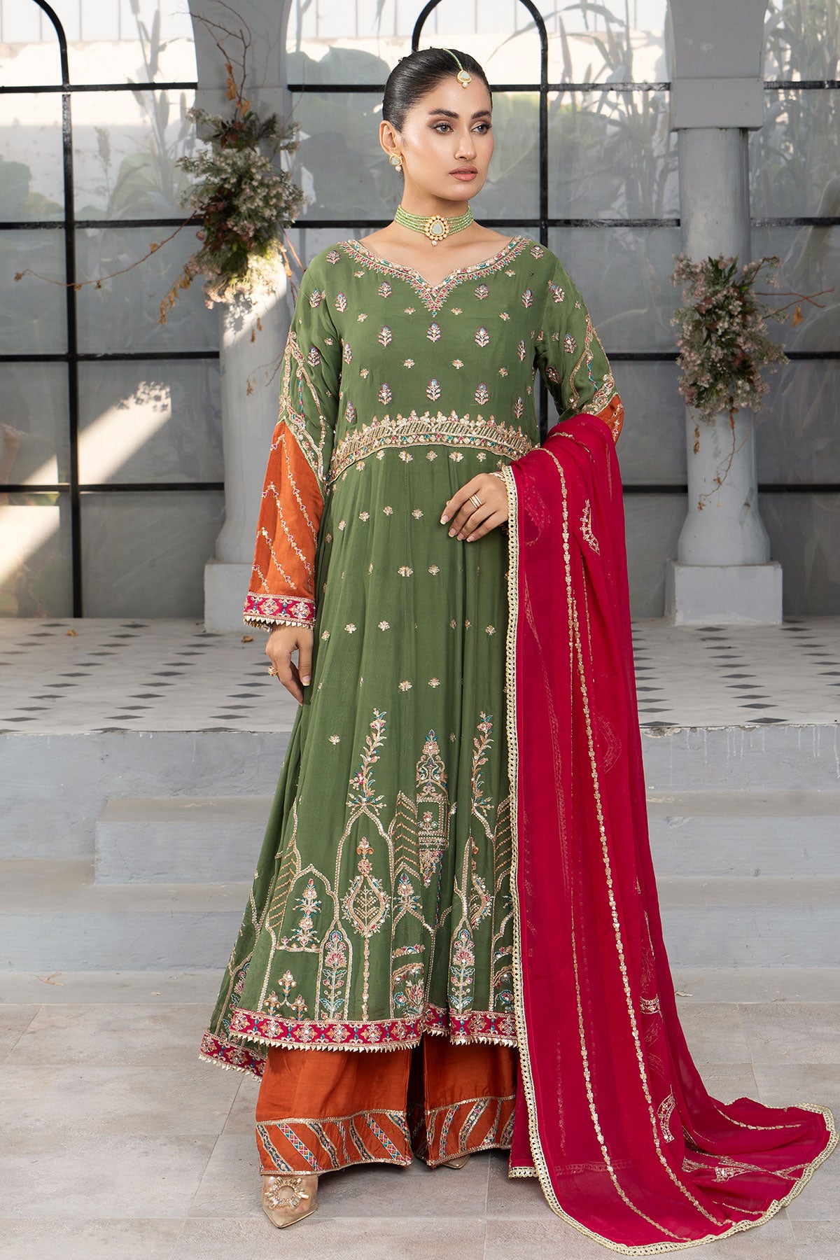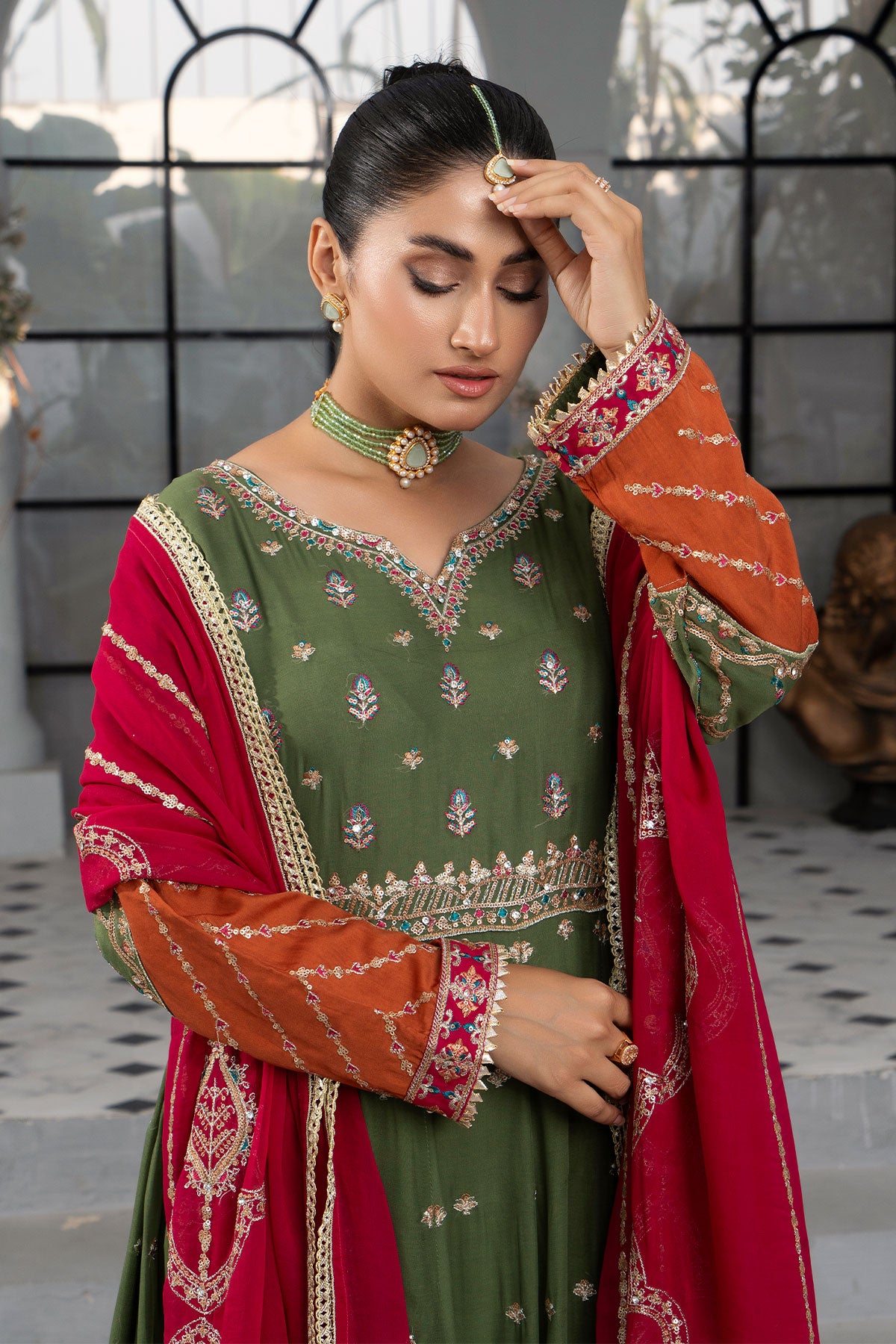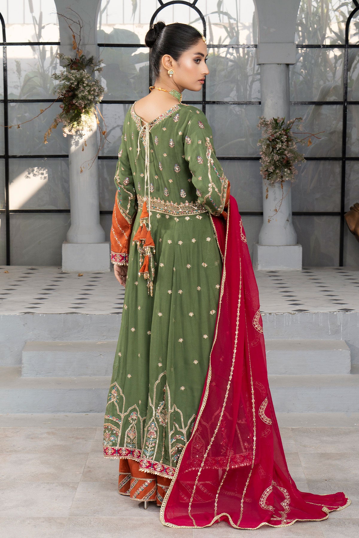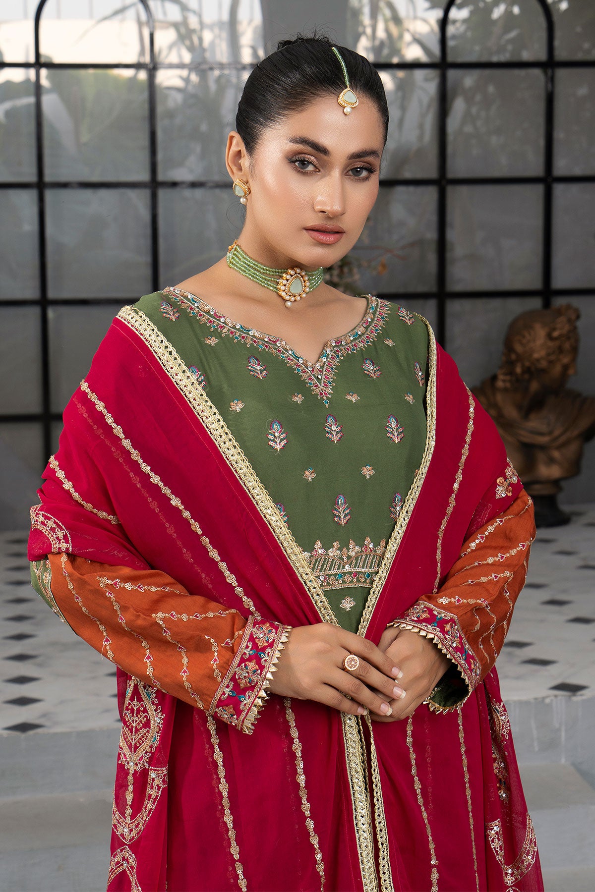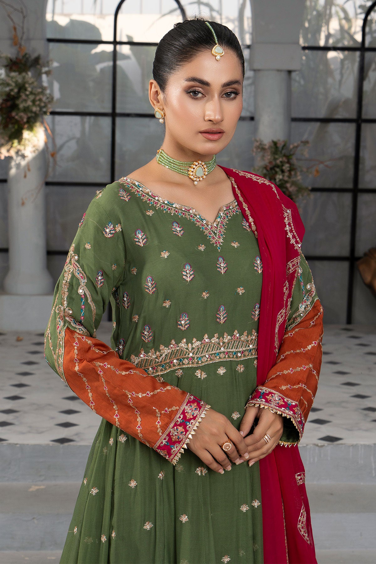 Elevate your wedding look with RN-47! This ready-to-wear outfit features embroidered chiffon with delicate stone work and lace, while the contrast chiffon dupatta adds an extra touch of elegance. The embroidered sleeves and sharara bring a beautiful contrast to complete your special day.