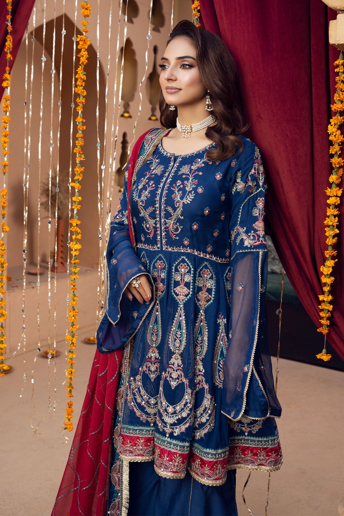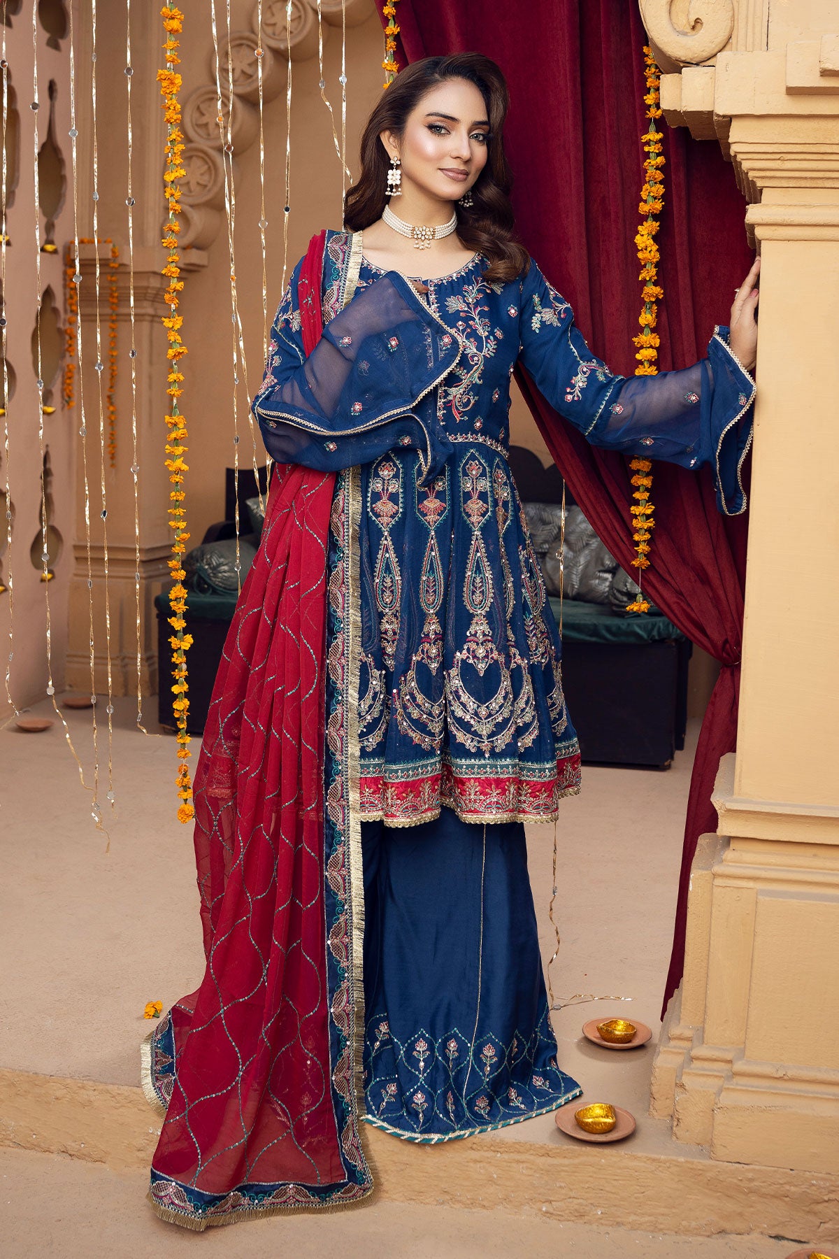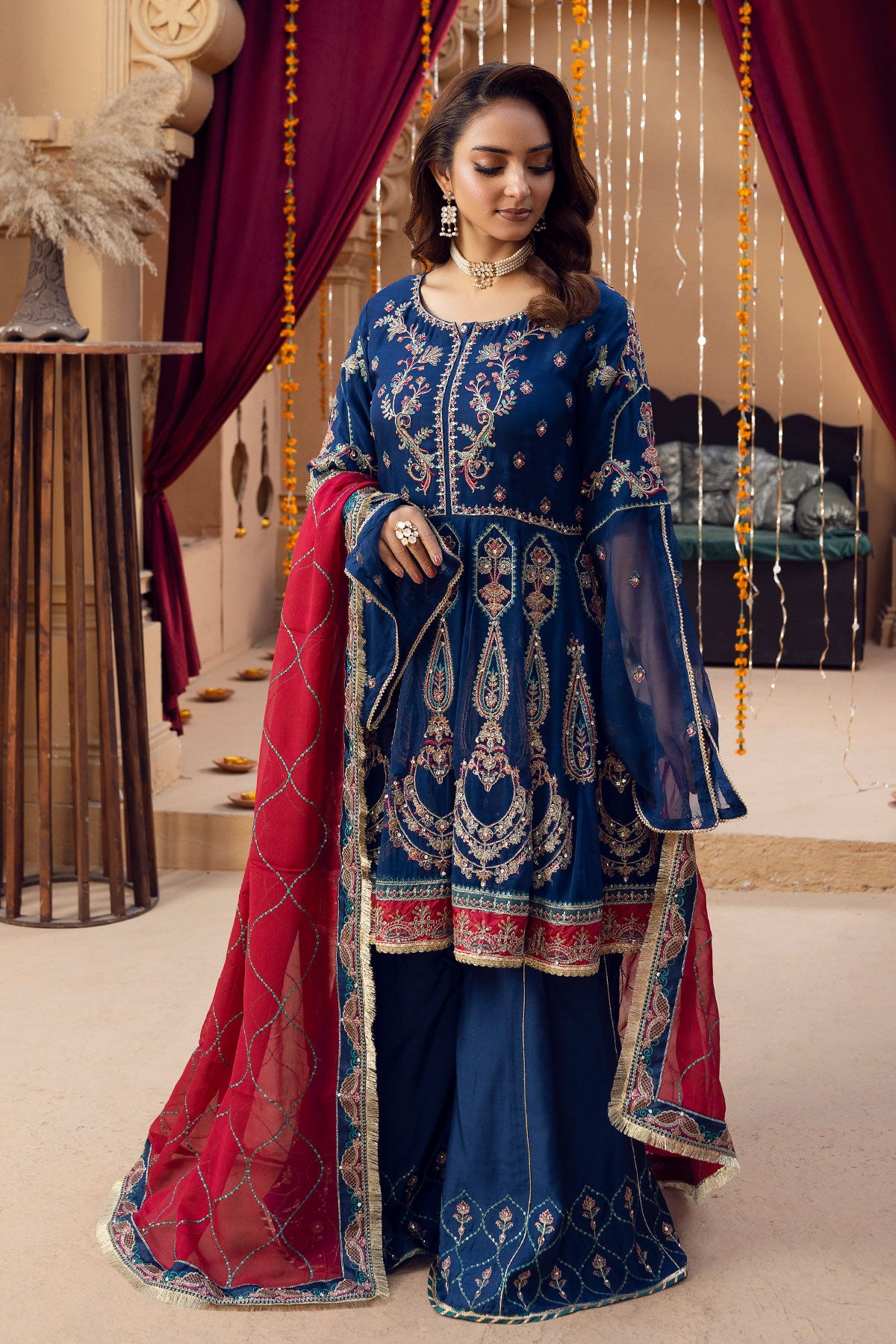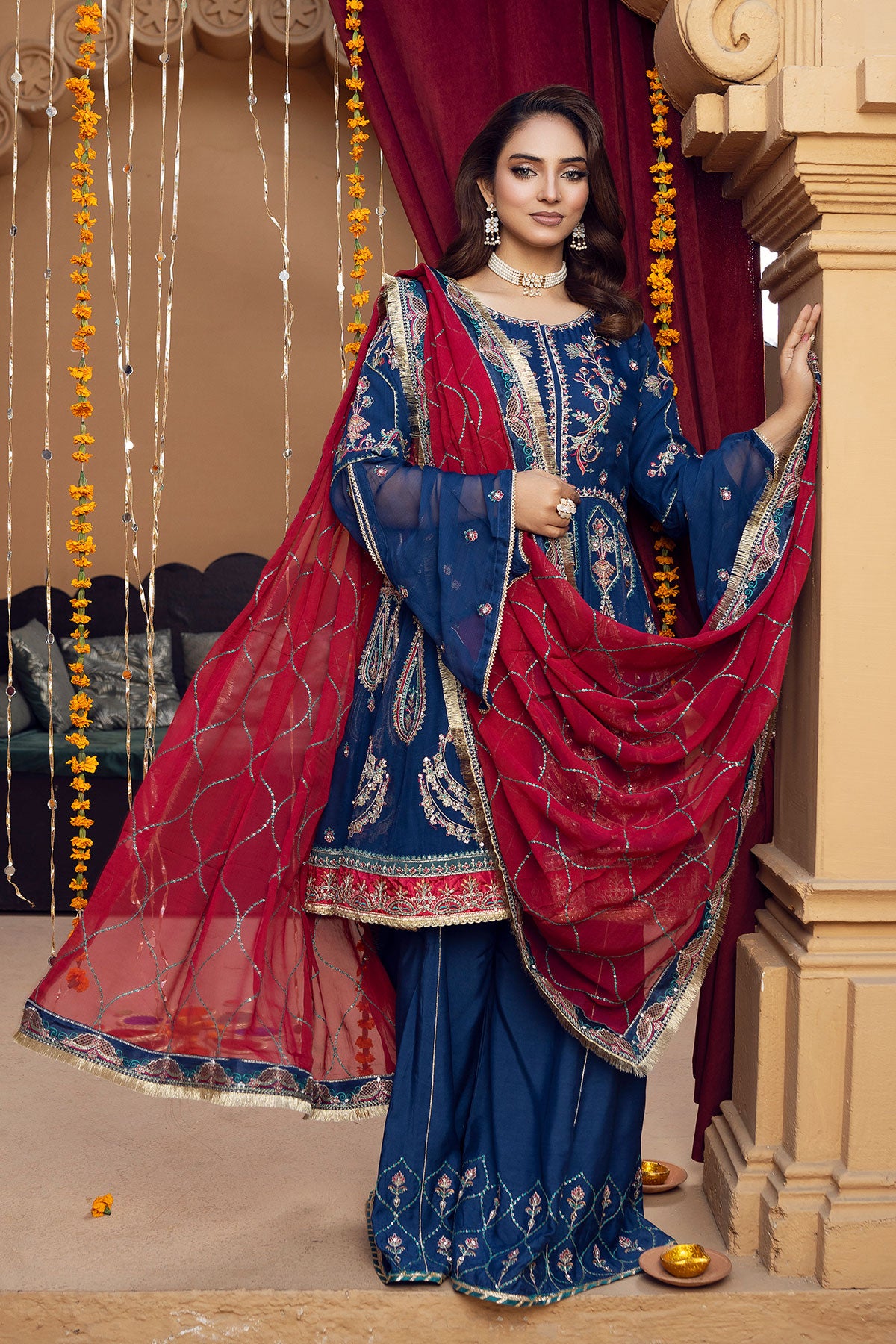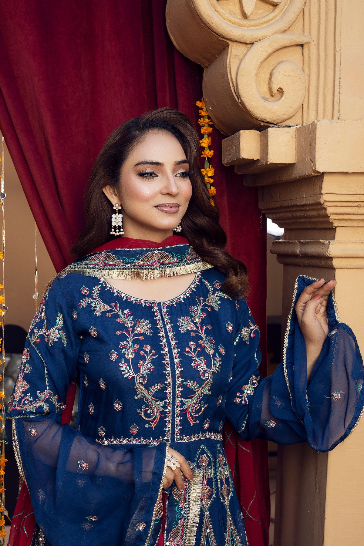 Elevate your wedding look with RN-54. This ready-to-wear chiffon embroidered top showcases intricate stone work and lace, while the viscose sharara adds a touch of luxury. Complete the ensemble with the chiffon dupatta adorned with delicate embroidery and stone work.