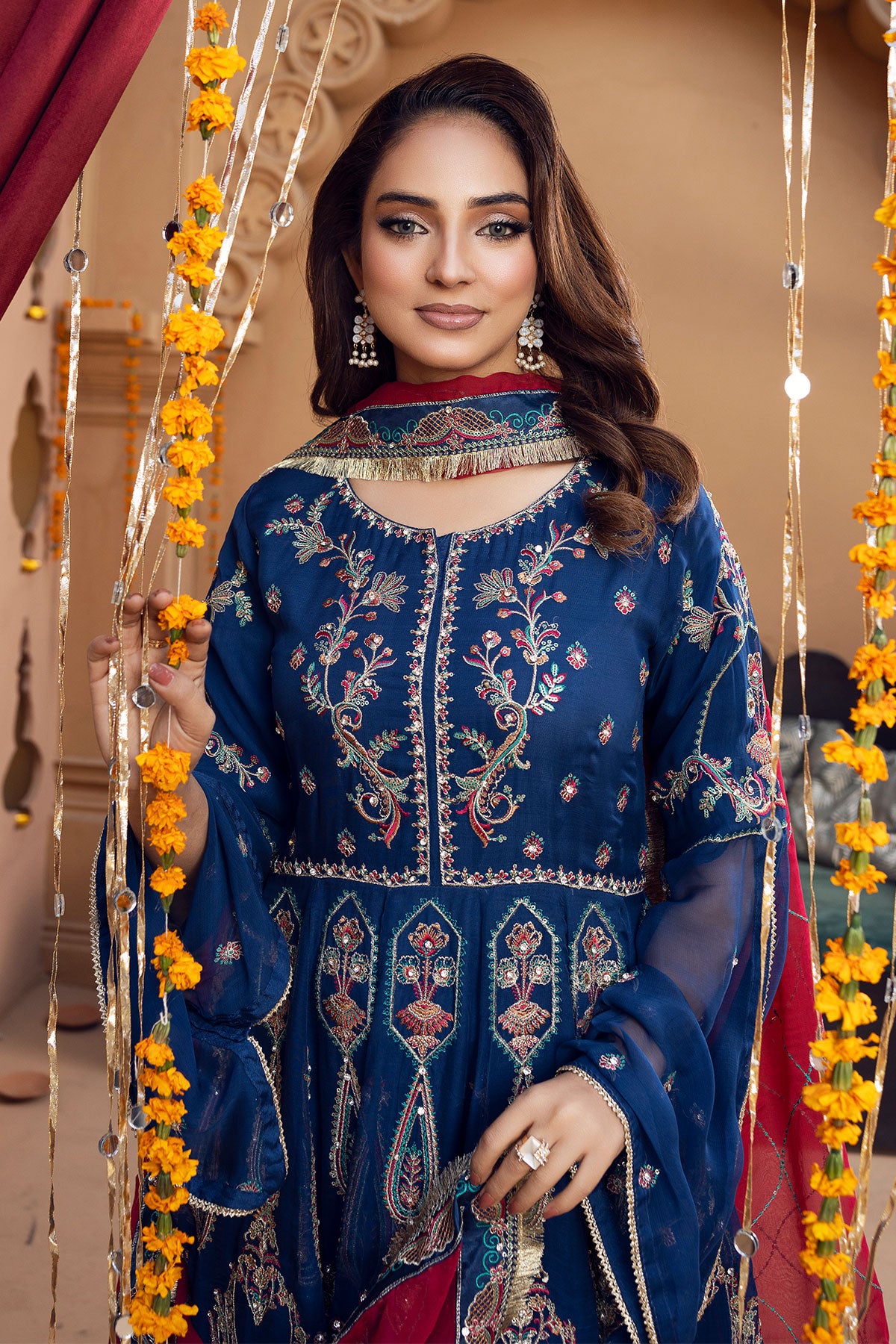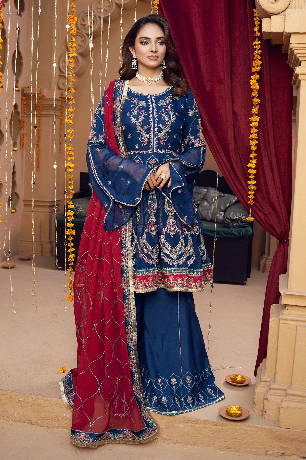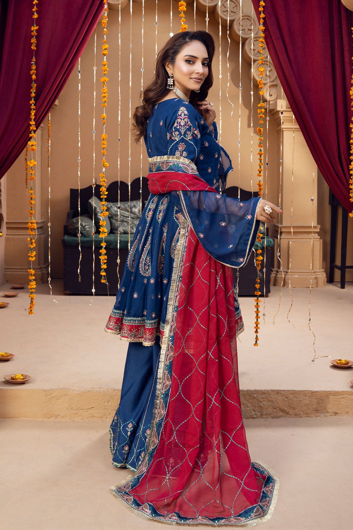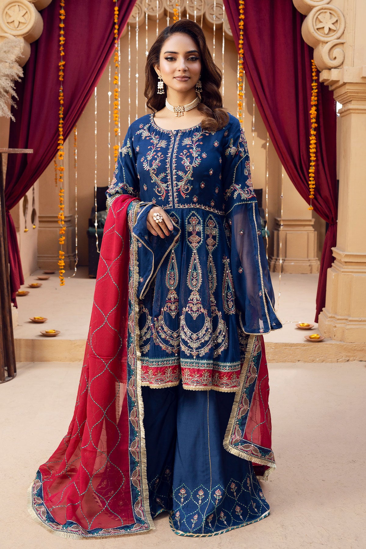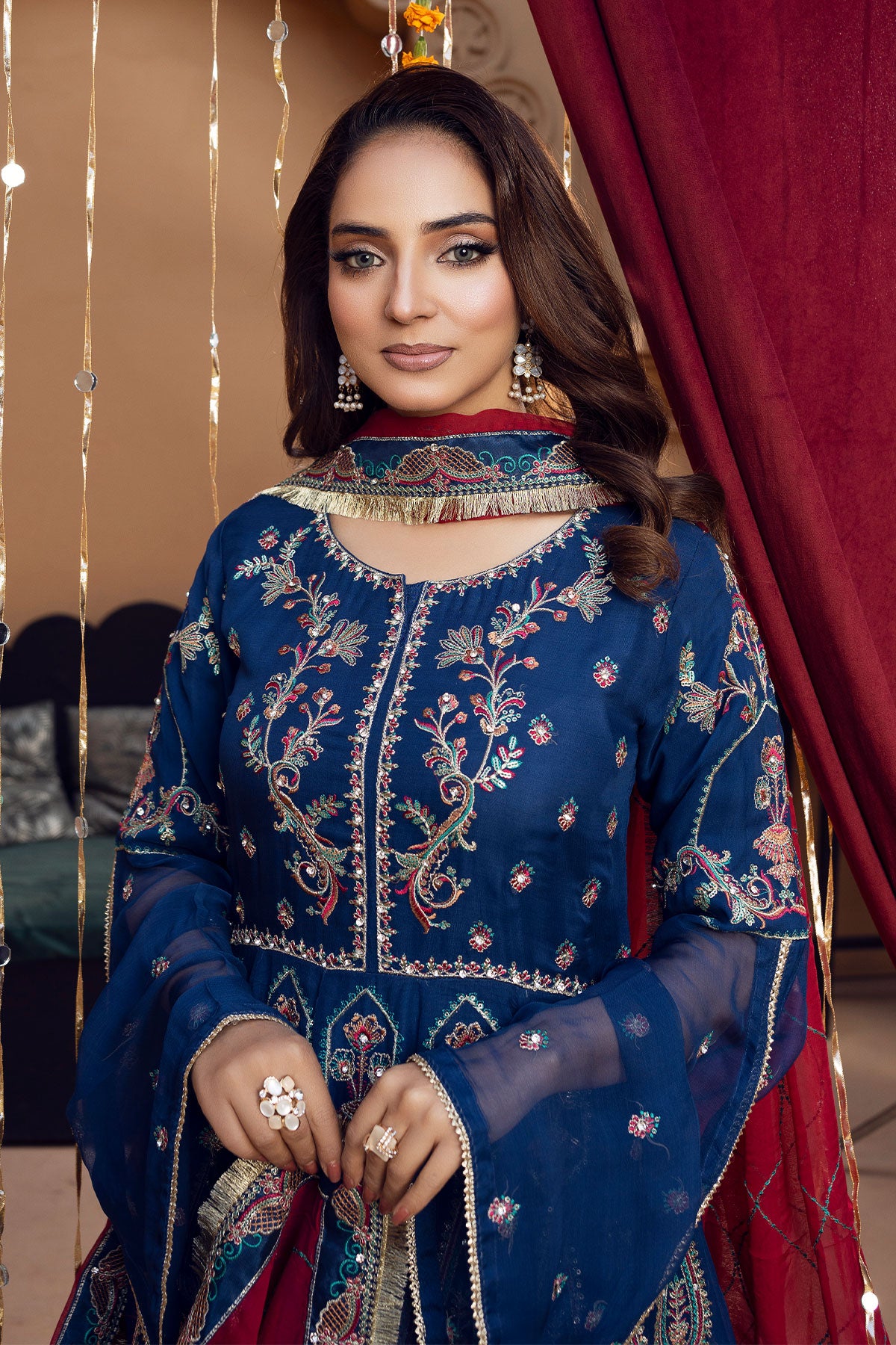 Elevate your wedding look with RN-54. This ready-to-wear chiffon embroidered top showcases intricate stone work and lace, while the viscose sharara adds a touch of luxury. Complete the ensemble with the chiffon dupatta adorned with delicate embroidery and stone work.