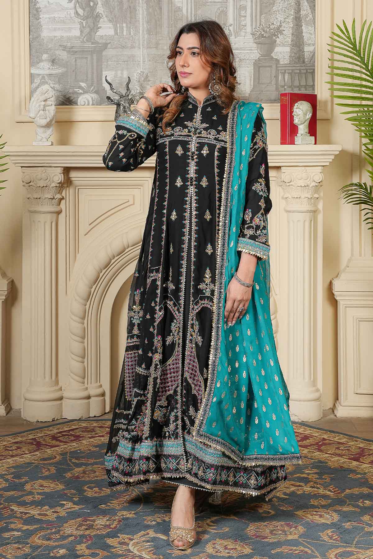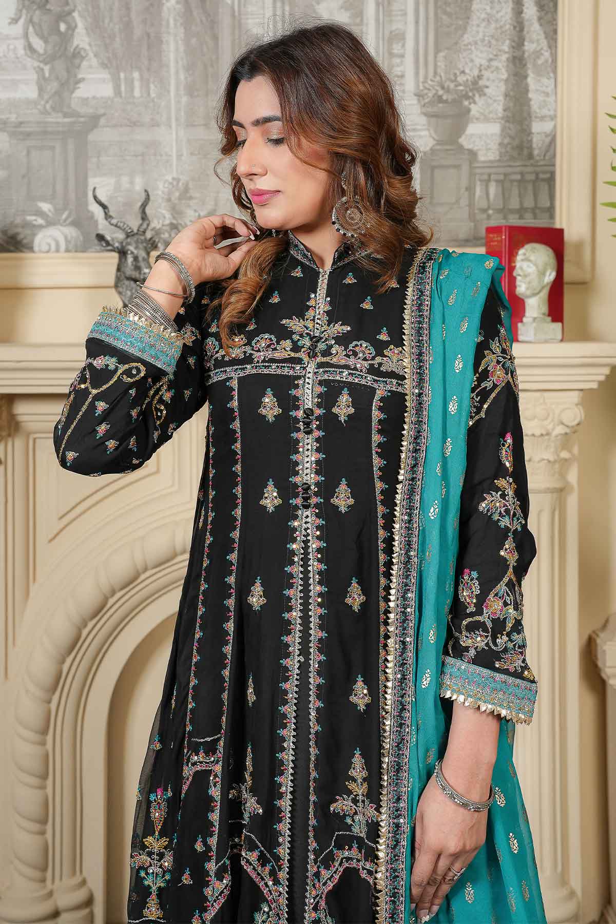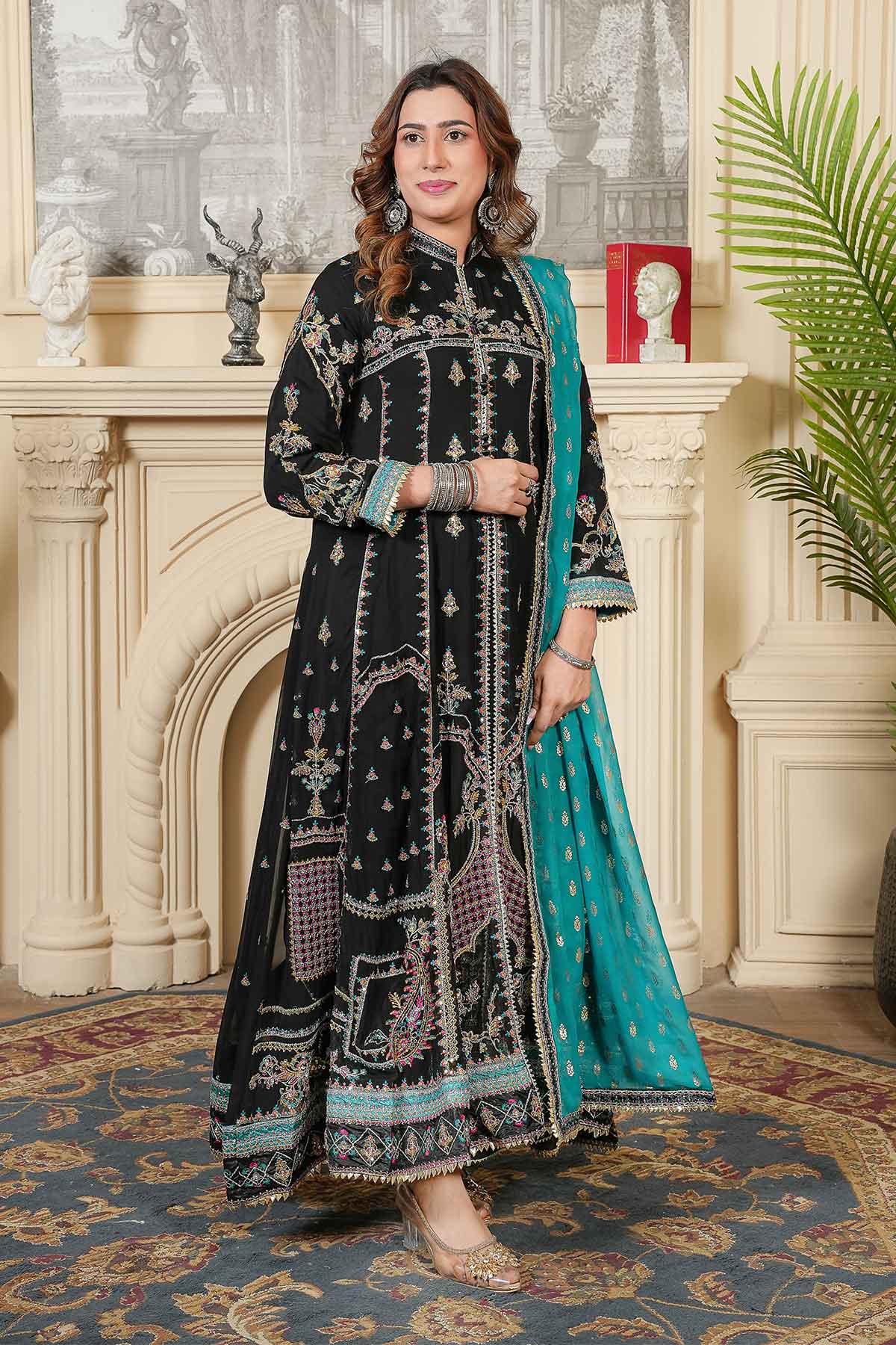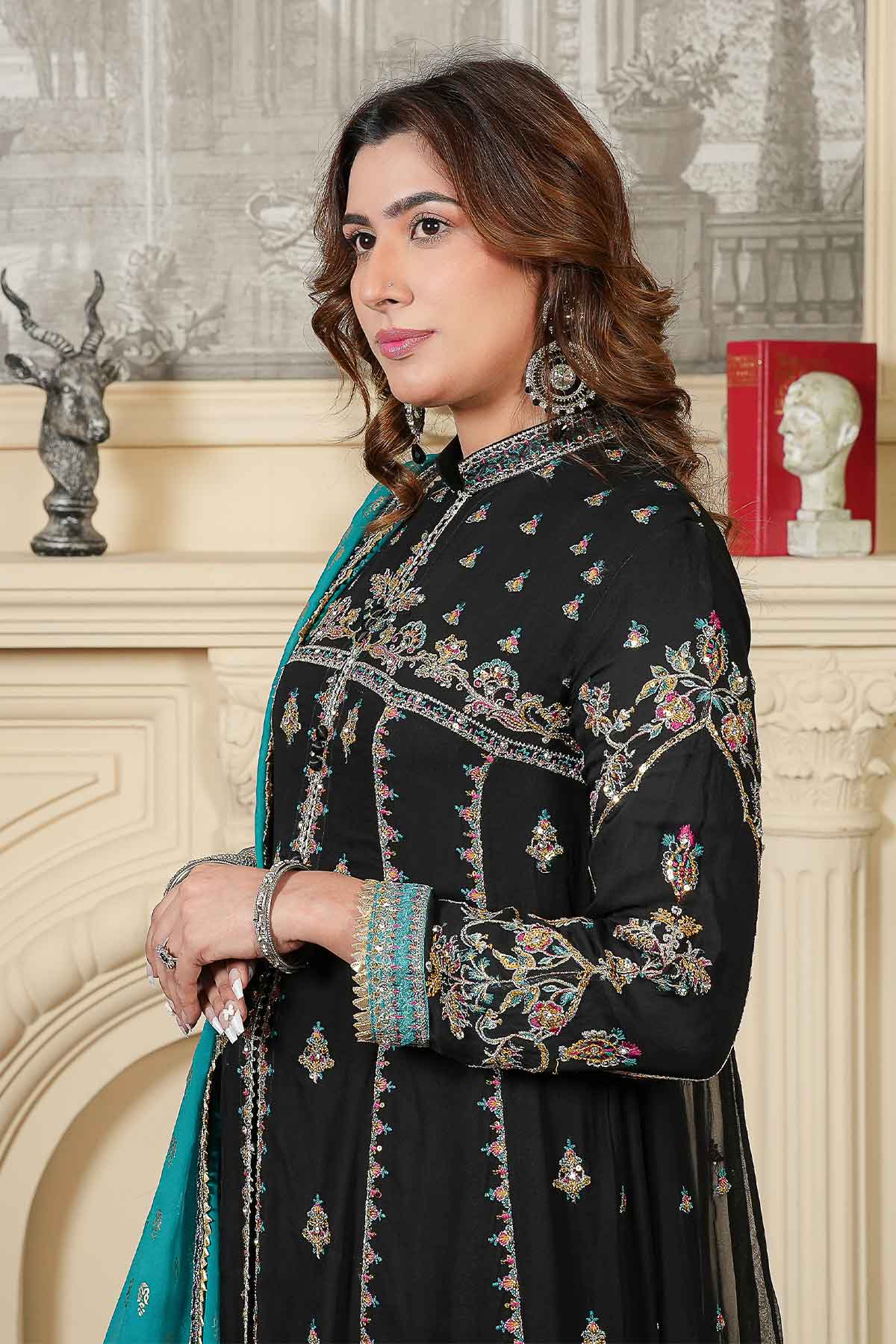 This elegant outfit features intricate embroidery on the front and back of soft chiffon, enhanced with delicate stonework and lace for a refined look. Paired with plain viscose trousers for comfort and style, it is completed by a beautifully patterned pani print chiffon dupatta. Perfectly crafted for formal occasions, this ready-to-wear ensemble offers a blend of sophistication and ease.