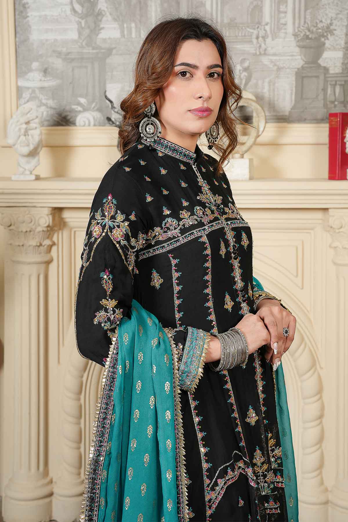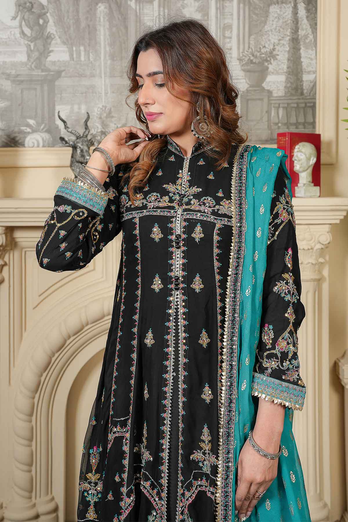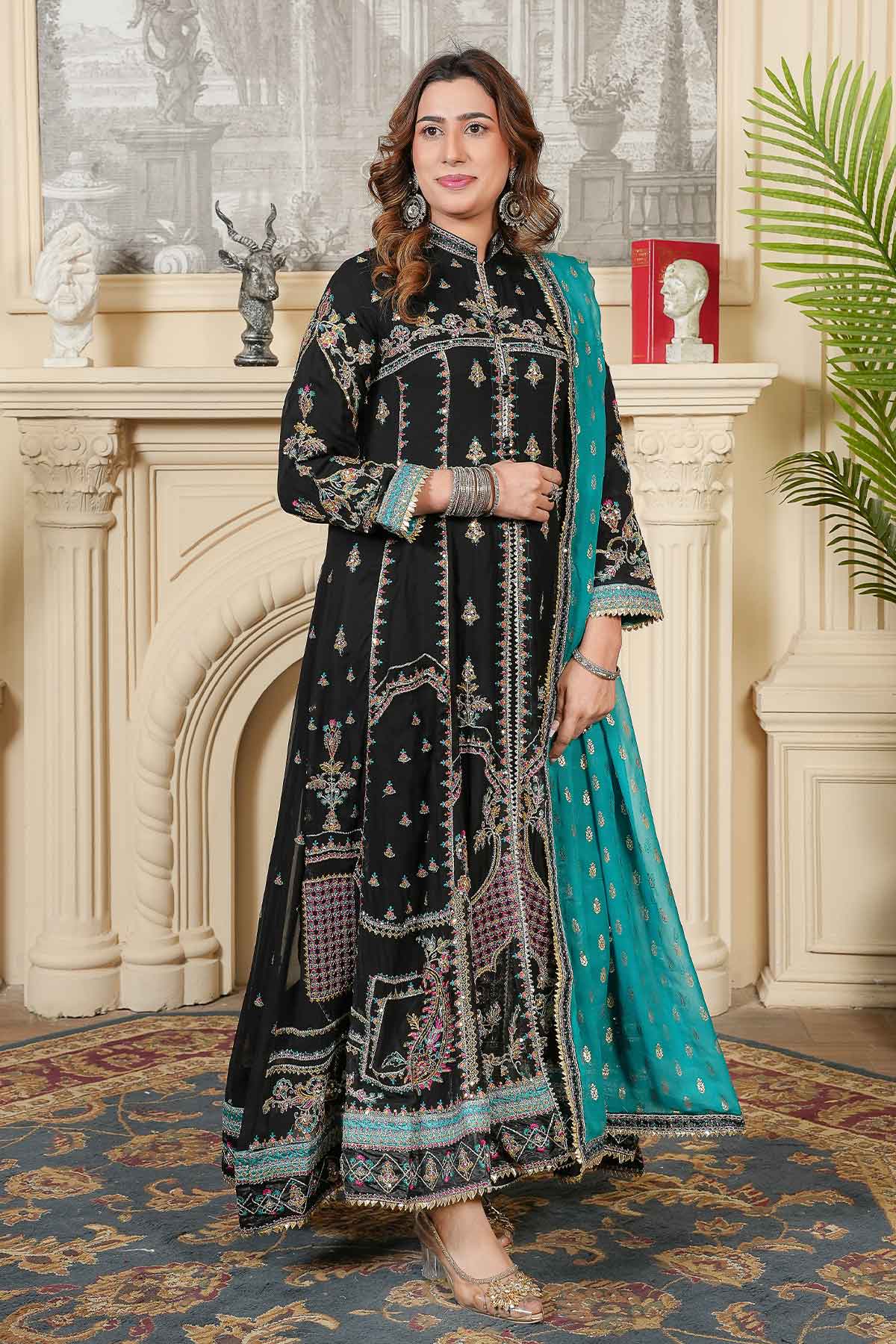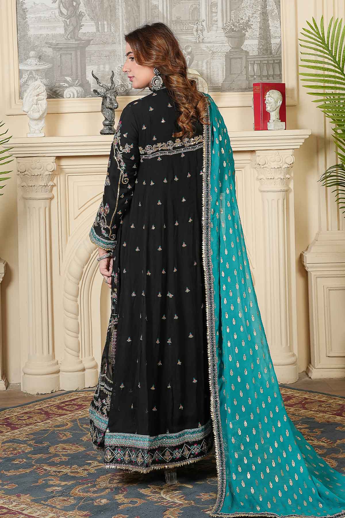 This elegant outfit features intricate embroidery on the front and back of soft chiffon, enhanced with delicate stonework and lace for a refined look. Paired with plain viscose trousers for comfort and style, it is completed by a beautifully patterned pani print chiffon dupatta. Perfectly crafted for formal occasions, this ready-to-wear ensemble offers a blend of sophistication and ease.
