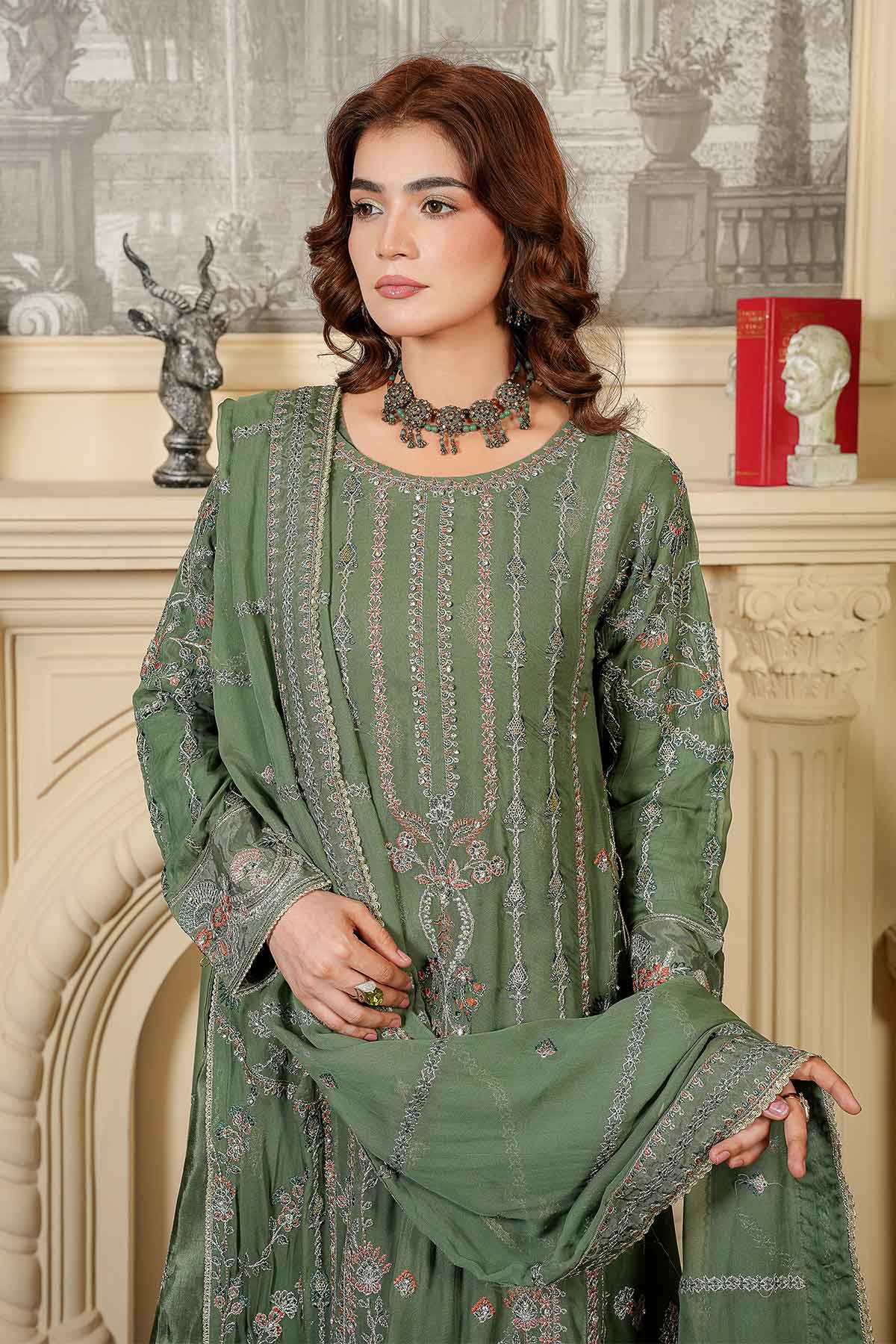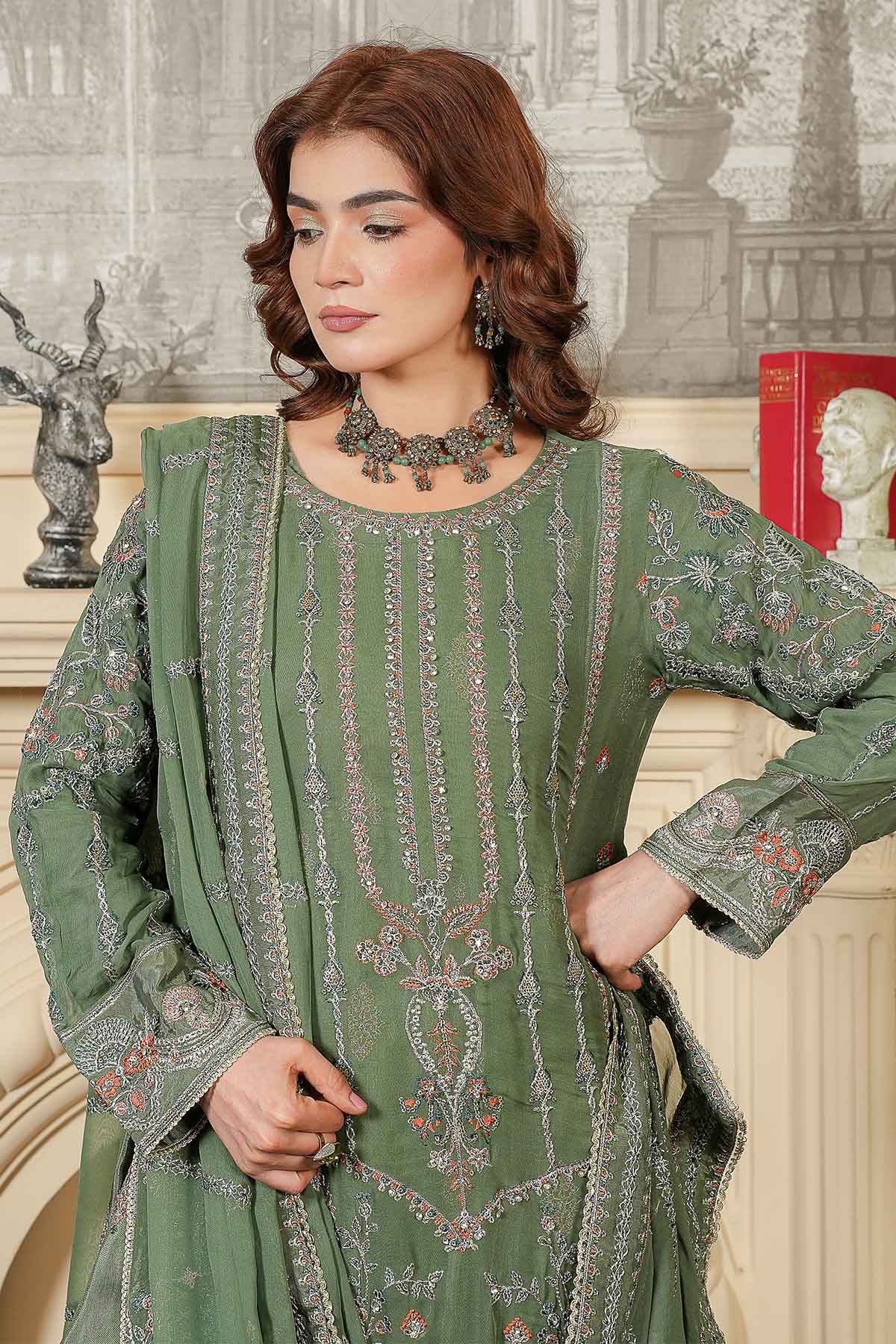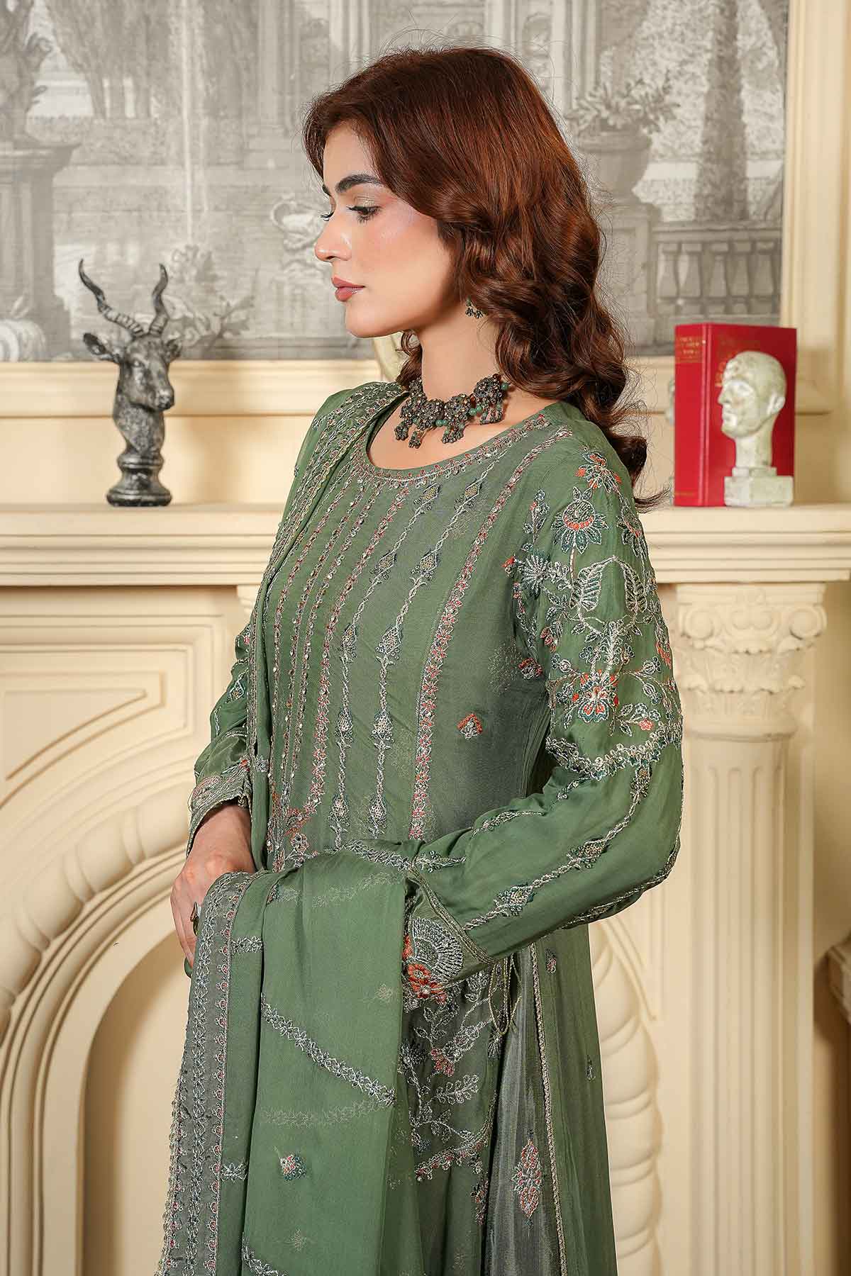Elevate your wardrobe with this stunning three-piece ensemble designed for the modern woman. The outfit features exquisitely embroidered front and back panels on luxurious chiffon, complemented by sleeves adorned with delicate lace and stone work that catches the light beautifully. Lined with soft inner embroidered tussle silk for comfort and elegance, it pairs perfectly with crisp plain grip trousers for a polished silhouette. Complete the look with the matching embroidered chiffon dupatta, finished with intricate lace detailing. Perfect for celebrations, gatherings, or whenever you want to feel absolutely radiant.