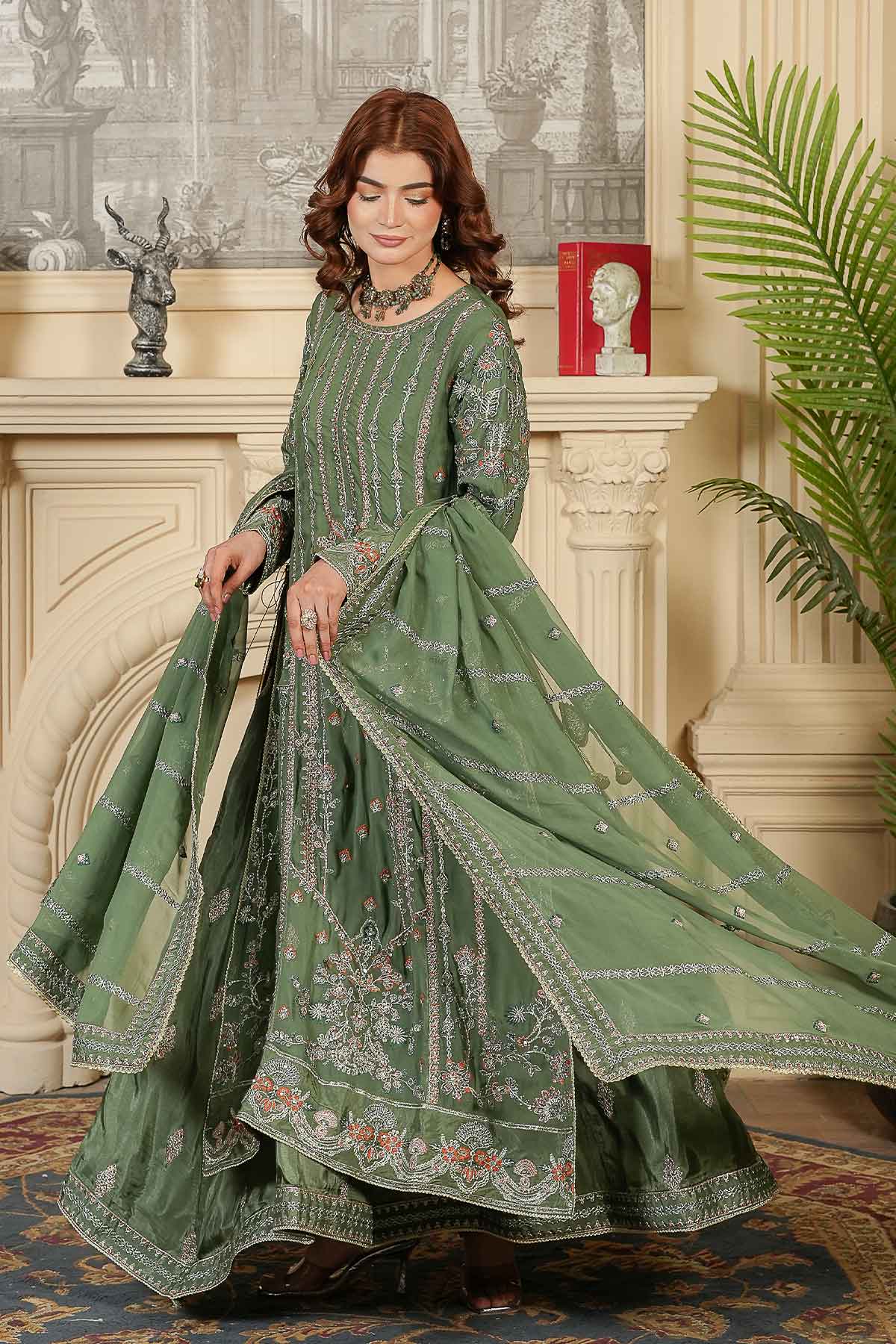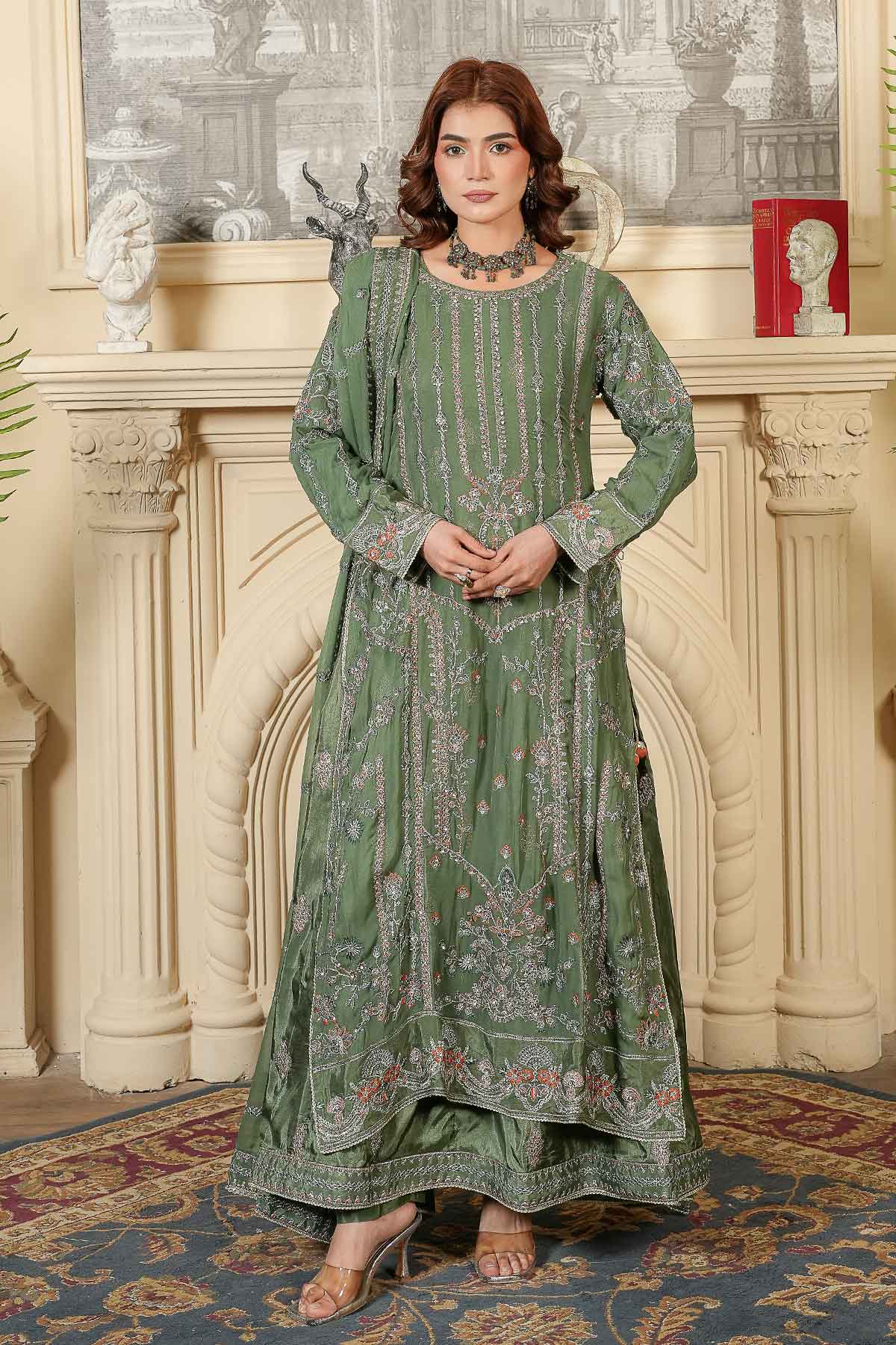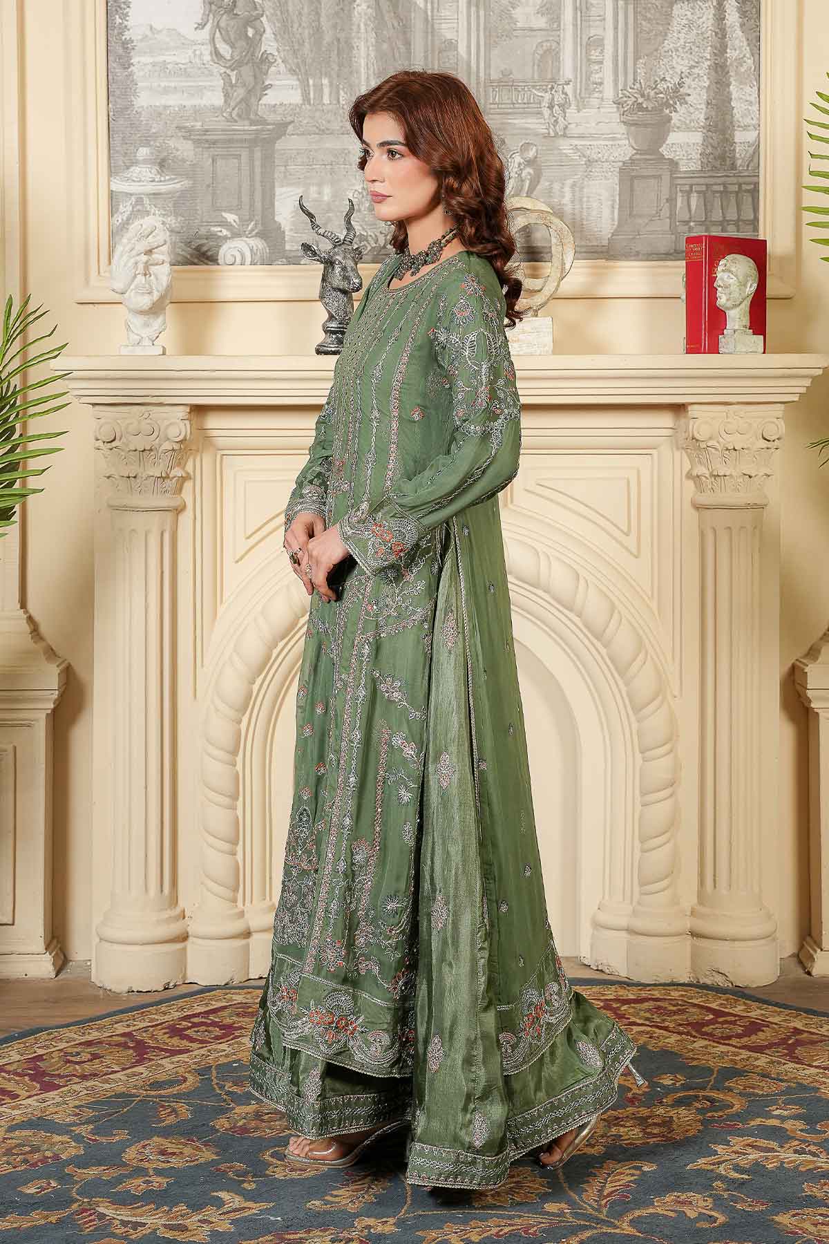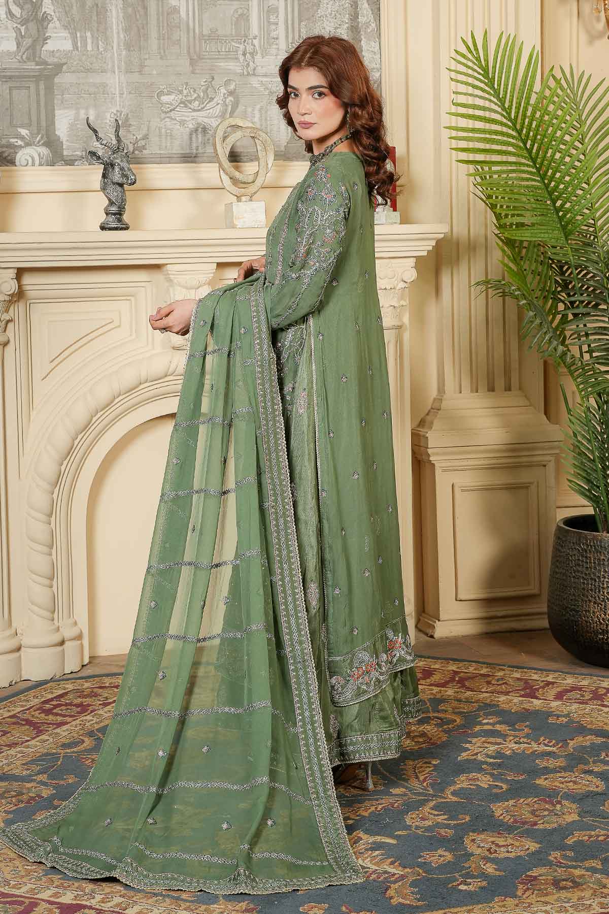 Elevate your wardrobe with this stunning three-piece ensemble designed for the modern woman. The outfit features exquisitely embroidered front and back panels on luxurious chiffon, complemented by sleeves adorned with delicate lace and stone work that catches the light beautifully. Lined with soft inner embroidered tussle silk for comfort and elegance, it pairs perfectly with crisp plain grip trousers for a polished silhouette. Complete the look with the matching embroidered chiffon dupatta, finished with intricate lace detailing. Perfect for celebrations, gatherings, or whenever you want to feel absolutely radiant.