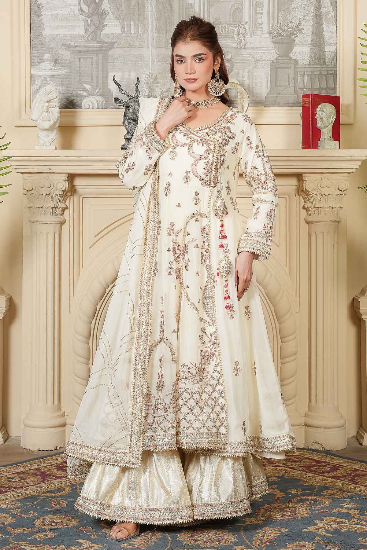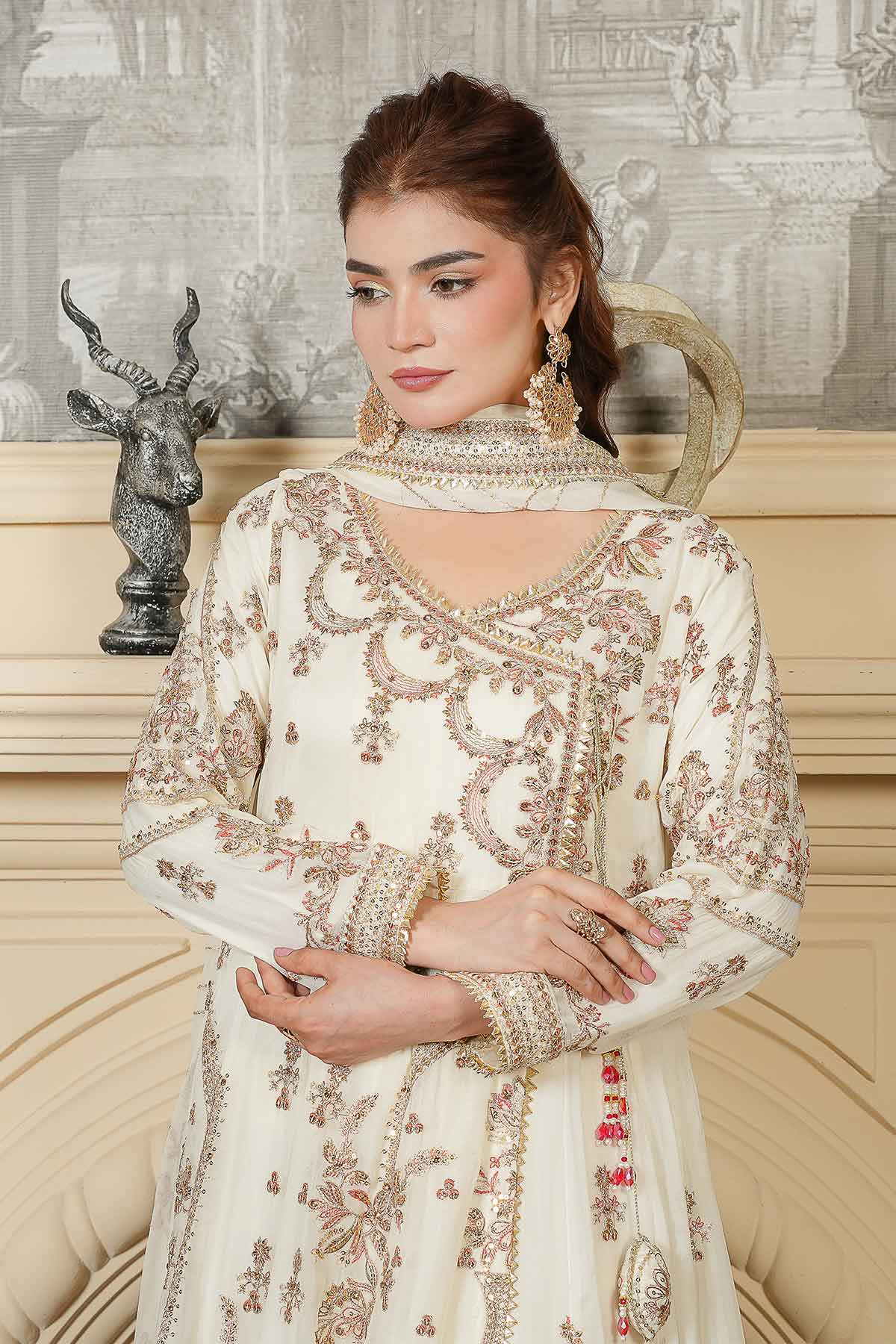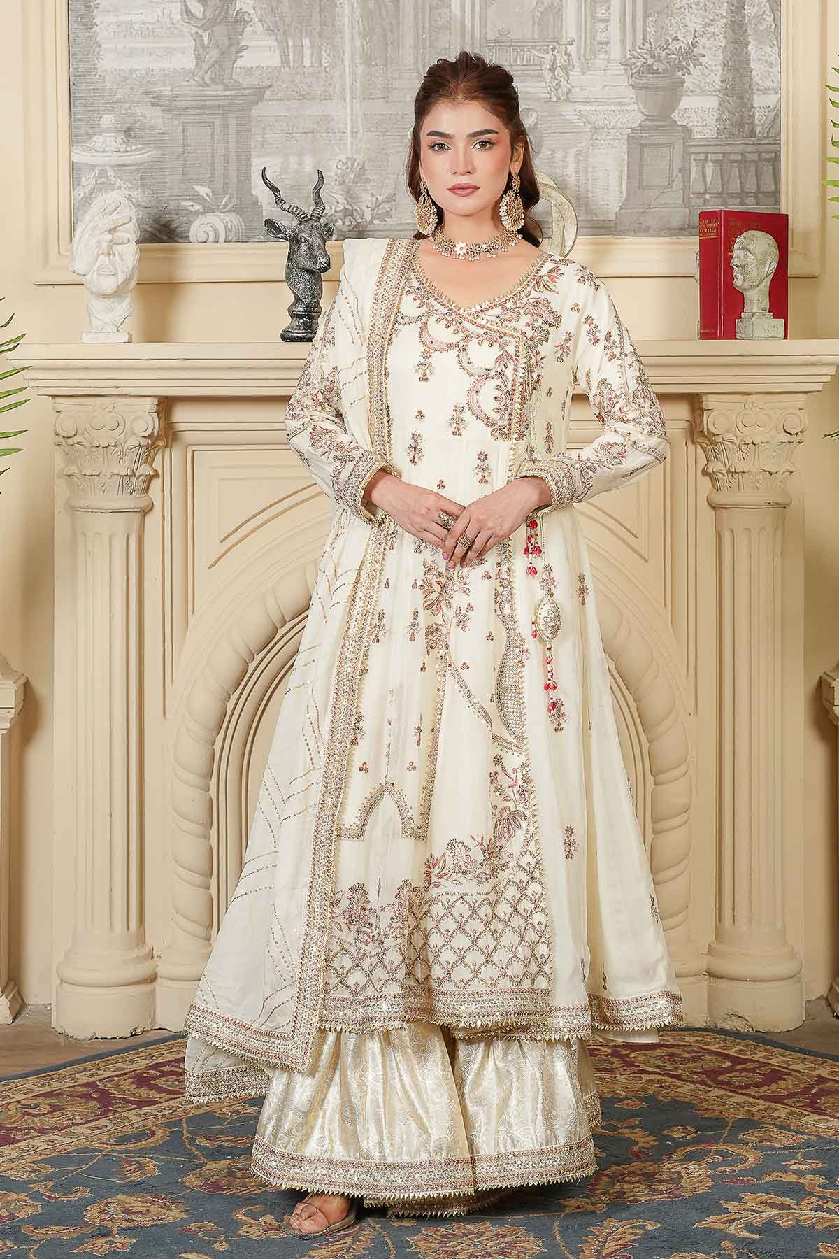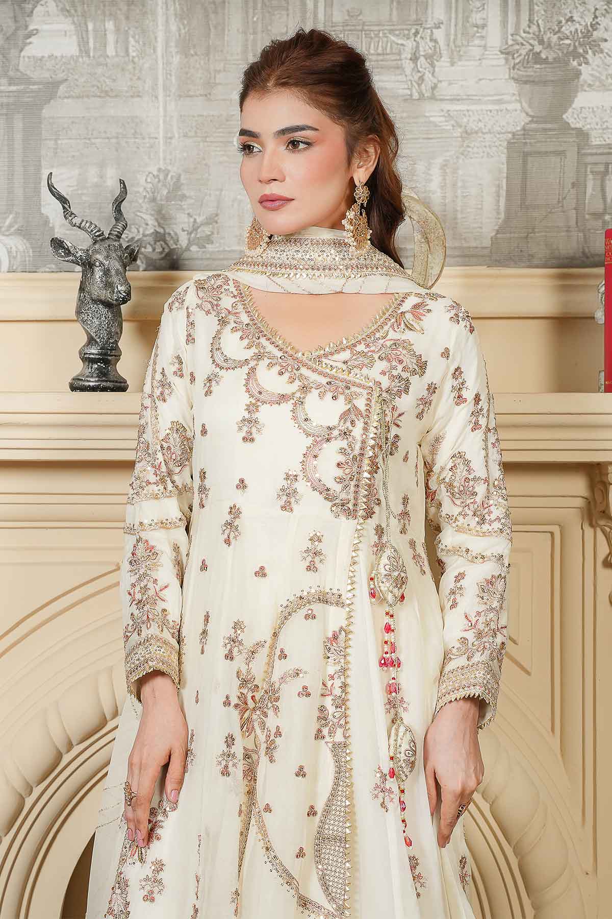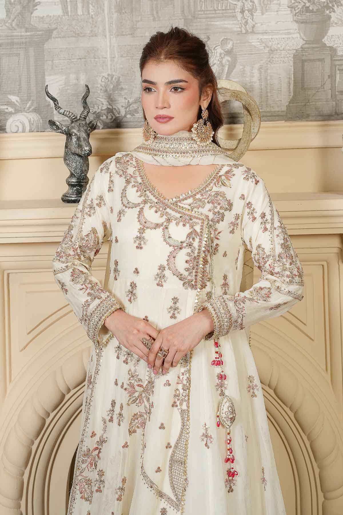 Celebrate your special day in timeless elegance with this exquisite three-piece ensemble. The intricately embroidered chiffon front and back feature stunning goti lace detailing and delicate stone work, perfectly complemented by graceful tassel accents. The matching embroidered chiffon dupatta, adorned with refined goti lace borders, adds an ethereal finishing touch. Complete your bridal look with the beautifully crafted jama war garara, designed to make you feel radiant and confident. Every stitch reflects traditional craftsmanship, creating a harmonious blend of sophistication and cultural beauty for your Nikah ceremony.