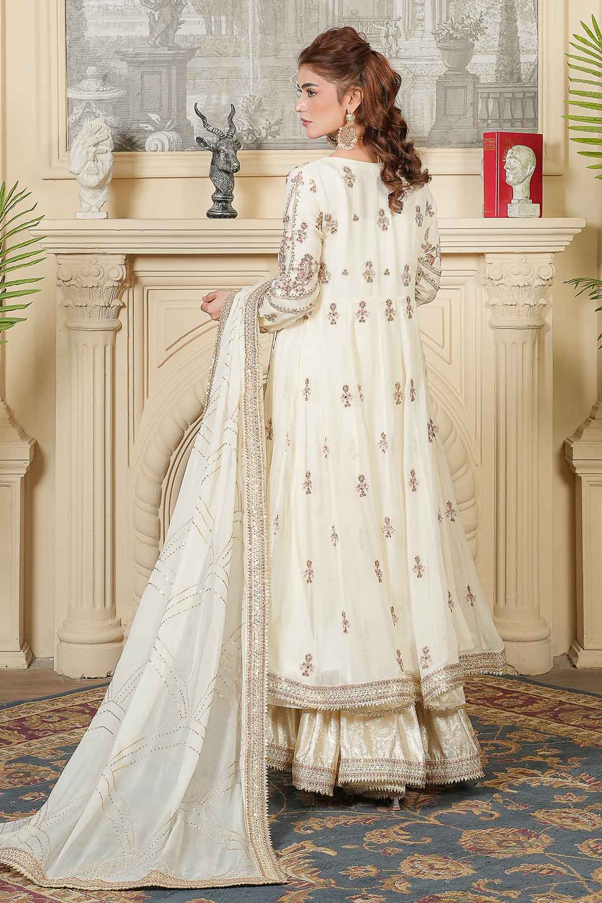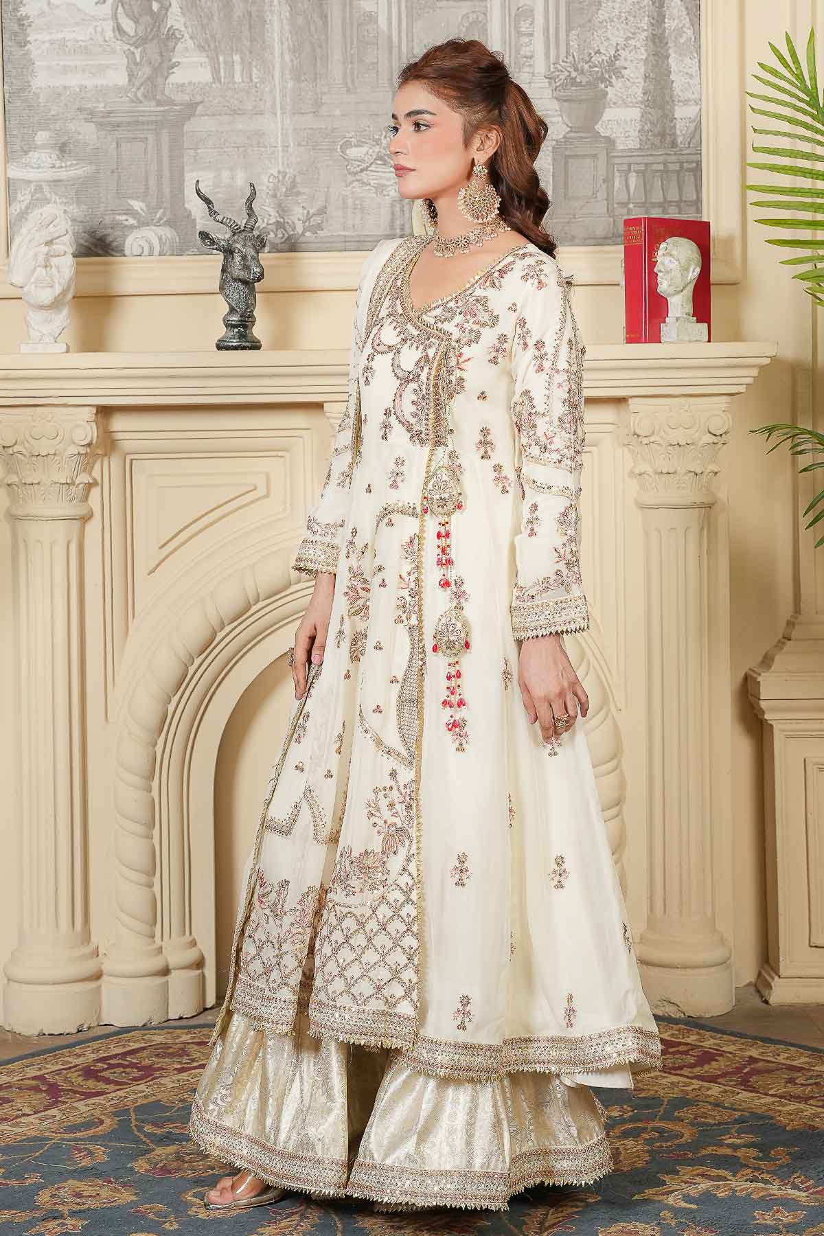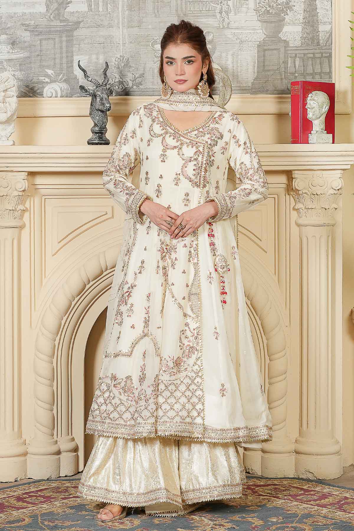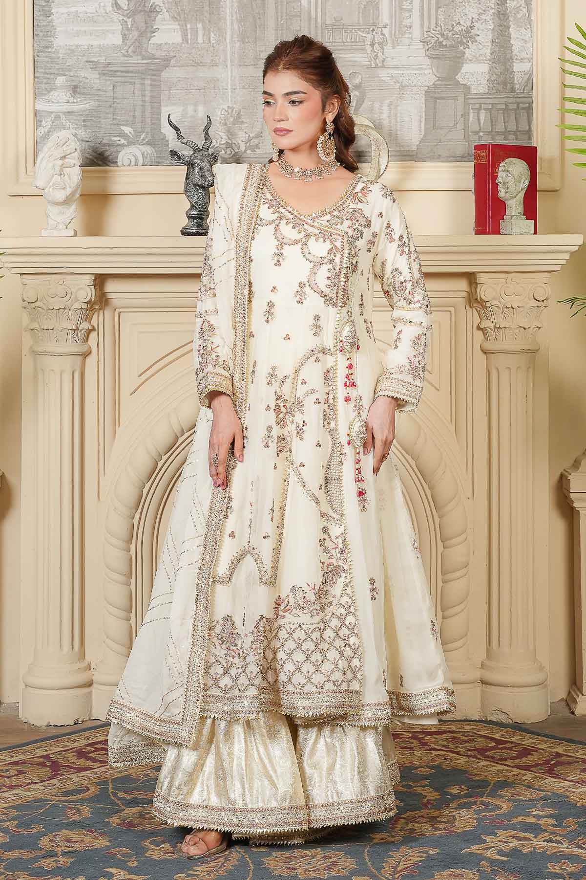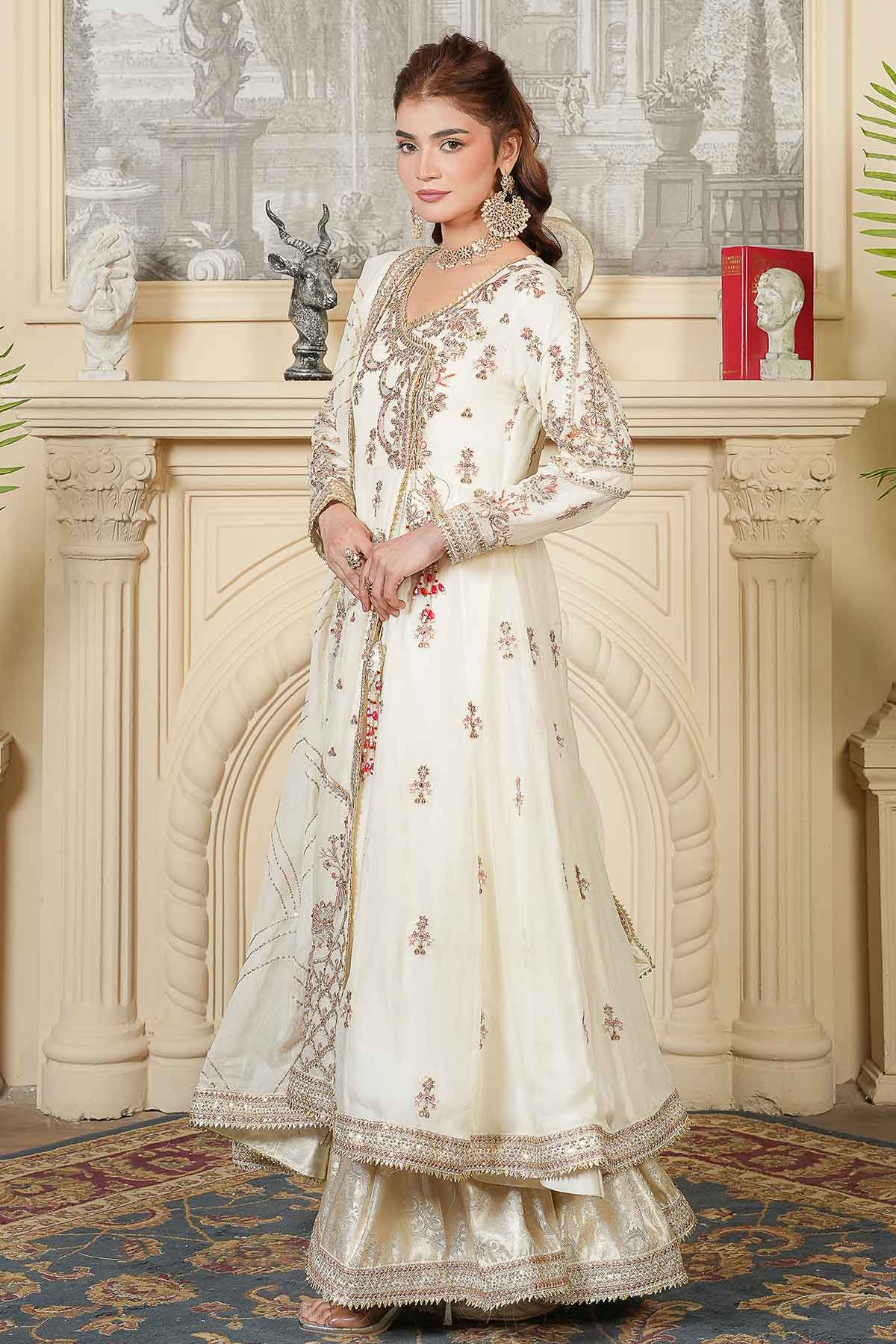 Celebrate your special day in timeless elegance with this exquisite three-piece ensemble. The intricately embroidered chiffon front and back feature stunning goti lace detailing and delicate stone work, perfectly complemented by graceful tassel accents. The matching embroidered chiffon dupatta, adorned with refined goti lace borders, adds an ethereal finishing touch. Complete your bridal look with the beautifully crafted jama war garara, designed to make you feel radiant and confident. Every stitch reflects traditional craftsmanship, creating a harmonious blend of sophistication and cultural beauty for your Nikah ceremony.