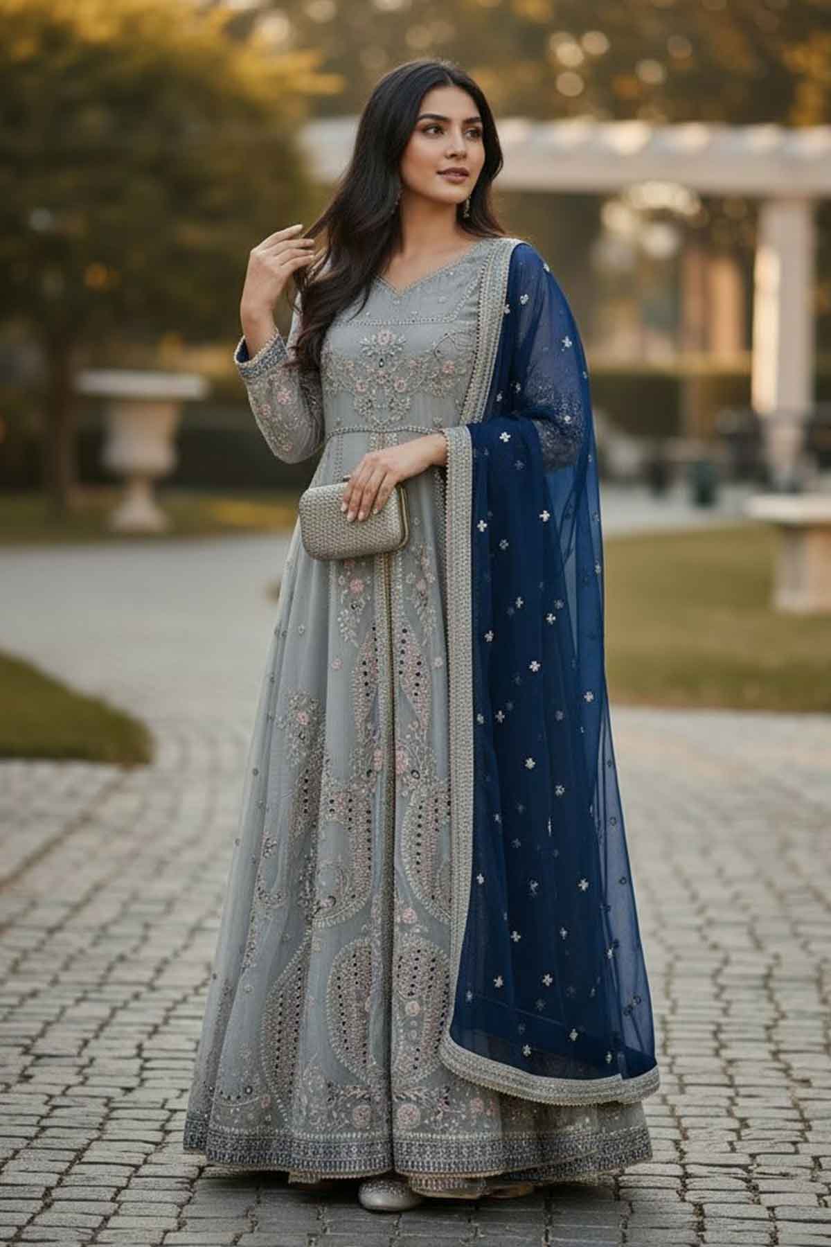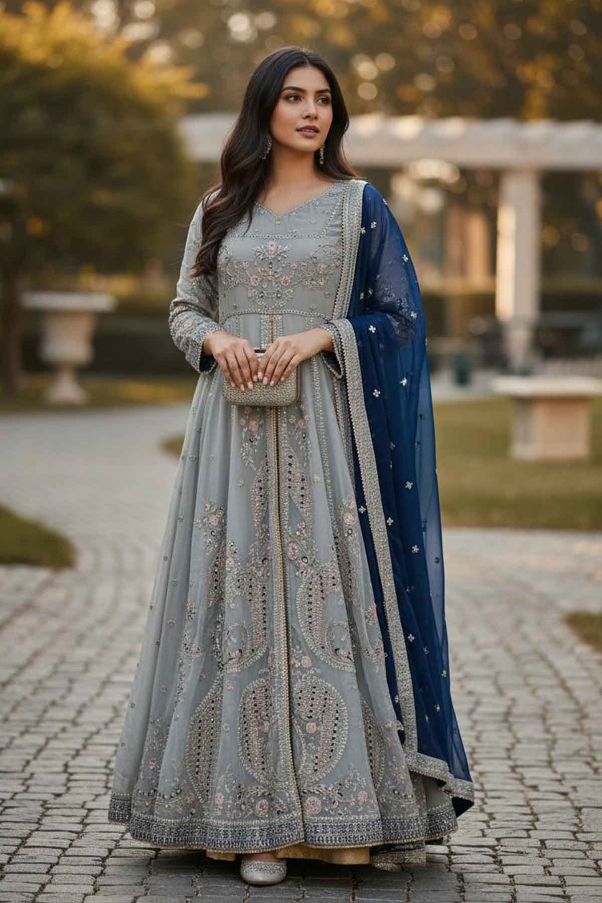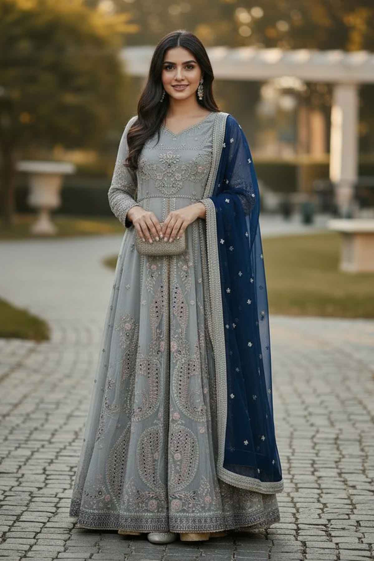 Elevate your wardrobe with this stunning three-piece ensemble that celebrates timeless elegance. The shirt features intricate embroidery adorning the front, back, and sleeves on luxurious chiffon, beautifully complemented by delicate stone work and lace detailing. The coordinating dupatta showcases matching embroidered chiffon with refined lace work, perfect for adding grace to any occasion. Complete the look with comfortable plain grip trousers that provide a polished finish. Ideal for weddings, celebrations, and special gatherings, this collection brings together traditional craftsmanship and contemporary style for a truly memorable appearance.