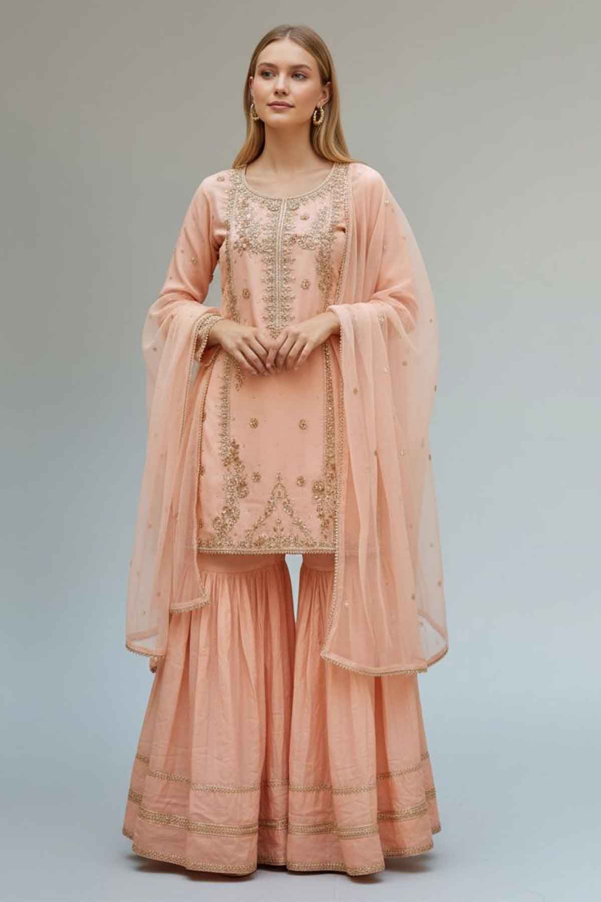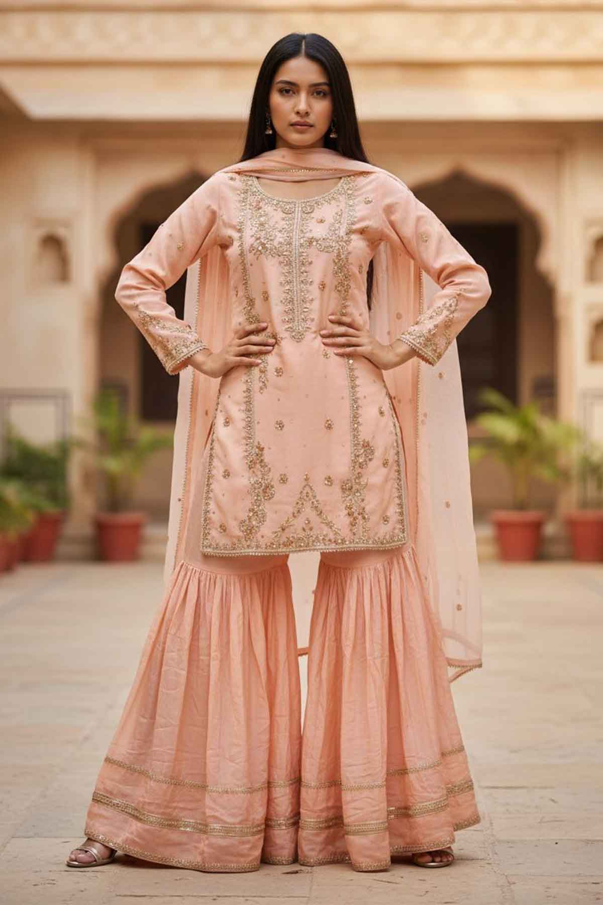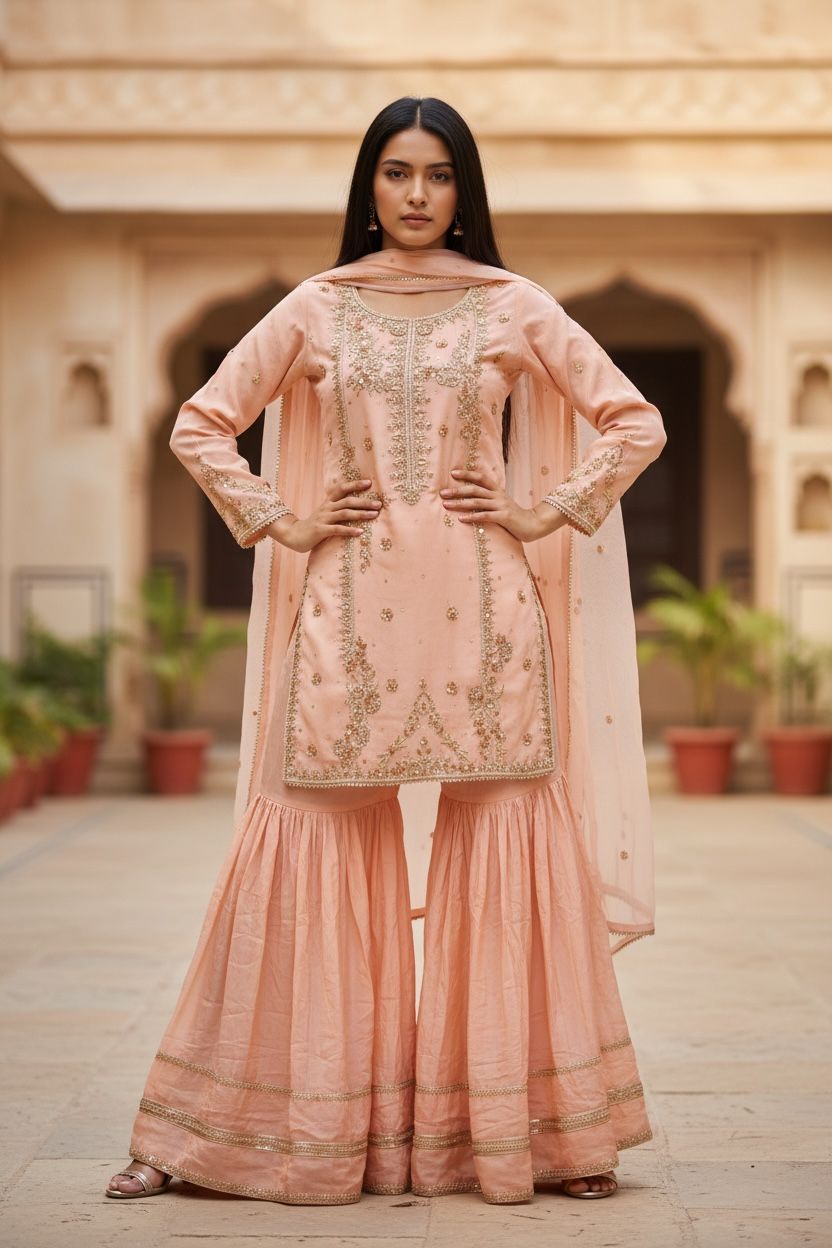Elevate your wedding day with this stunning handmade shirt crafted from luxurious shehsa silk. Featuring intricate dabka and kora/zari embroidery work on the front, this piece showcases traditional artistry at its finest. Paired with a flowing plain chiffon dupatta and comfortable grip garara, this ready-to-wear ensemble brings timeless elegance to your celebration. Perfect for brides seeking authentic craftsmanship blended with modern comfort, this wedding collection piece promises to make you feel absolutely radiant.