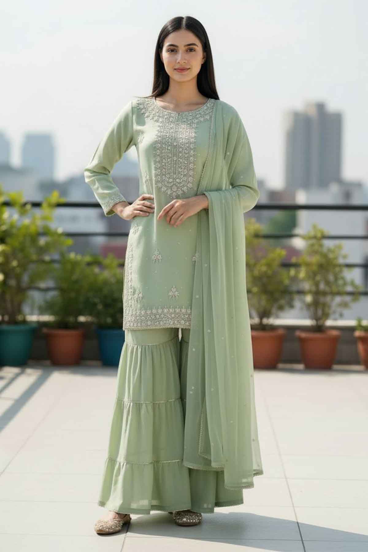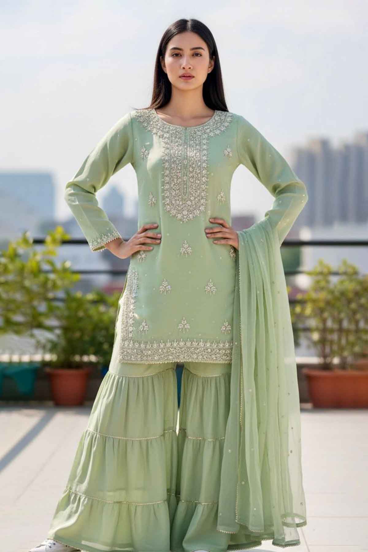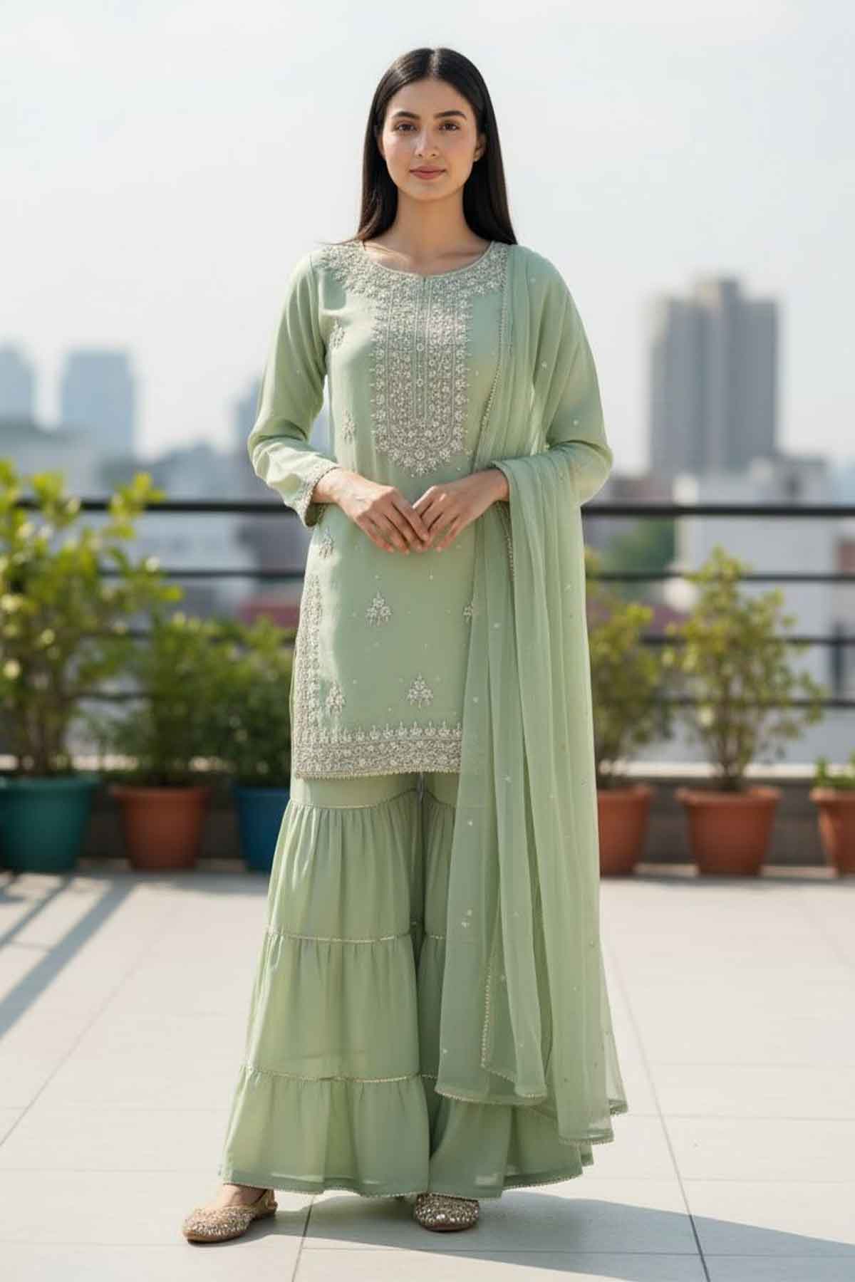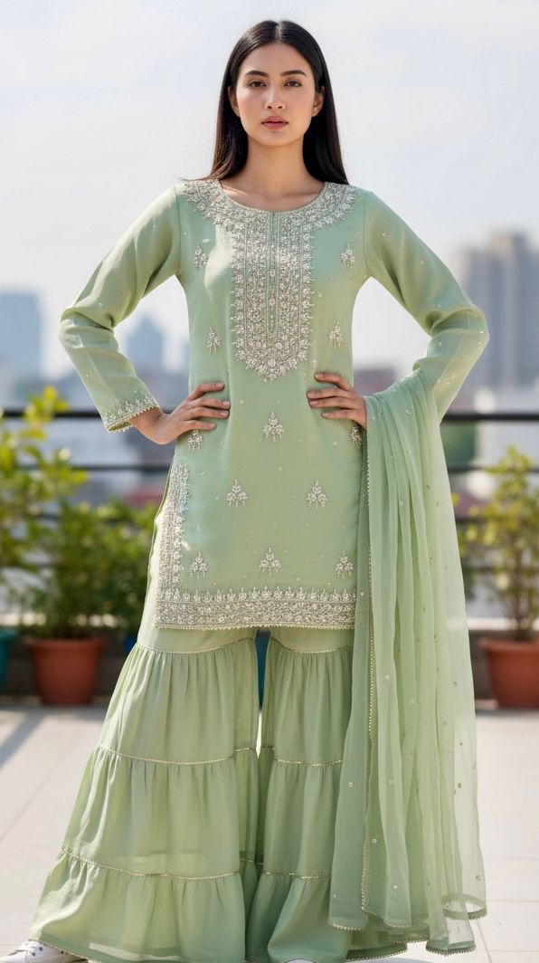 Elevate your wedding day with this stunning handmade shirt crafted from luxurious shehsa silk. Featuring intricate dabka and kora/zari embroidery work on the front, this piece showcases traditional artistry at its finest. Paired with a flowing plain chiffon dupatta and comfortable grip garara, this ready-to-wear ensemble brings timeless elegance to your celebration. Perfect for brides seeking authentic craftsmanship blended with modern comfort, this wedding collection piece promises to make you feel absolutely radiant.