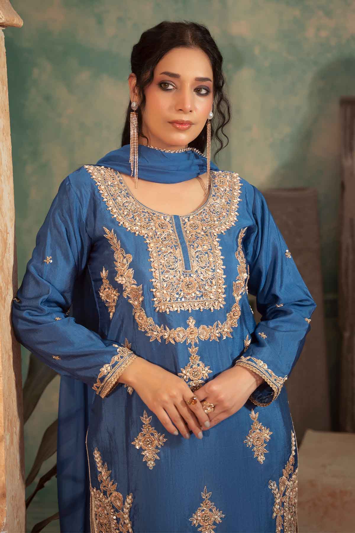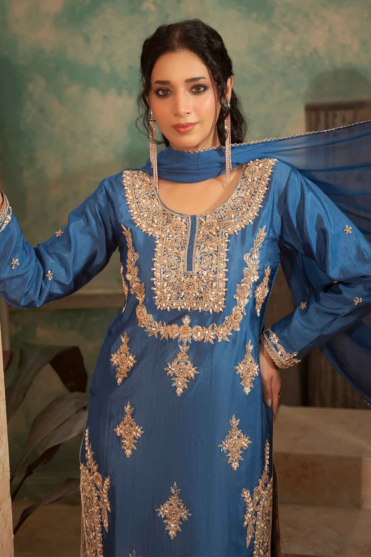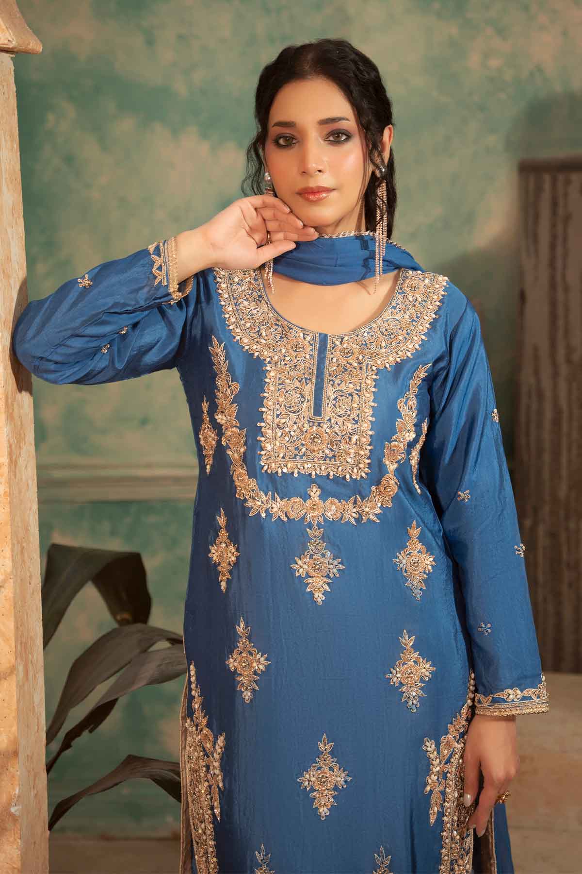 Elegant three-piece ensemble crafted from premium shesha silk with exquisite hand-embroidered front sleeves adorned with delicate lace work. The set features a flowing plain chiffon dupatta for graceful draping and comfortable plain grip trousers. Perfect for formal occasions and celebrations, this piece combines traditional craftsmanship with refined sophistication. Ideal for those seeking timeless elegance with meticulous attention to detail.