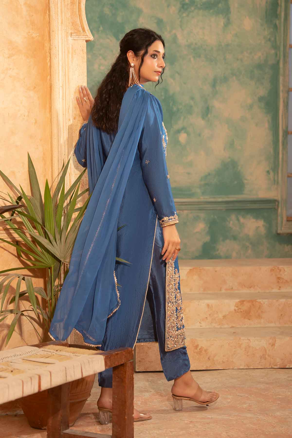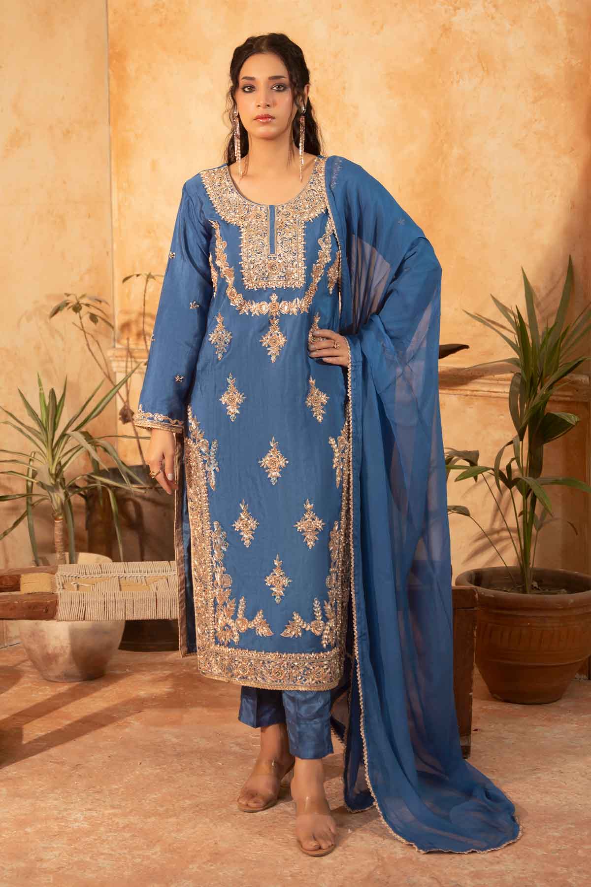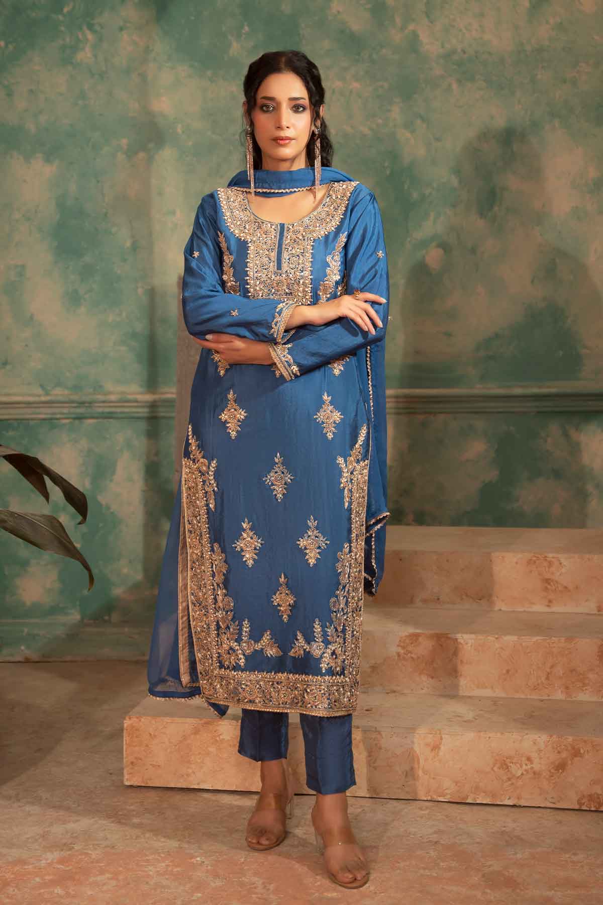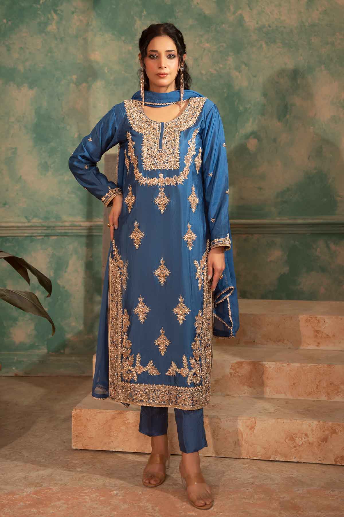 Elegant three-piece ensemble crafted from premium shesha silk with exquisite hand-embroidered front sleeves adorned with delicate lace work. The set features a flowing plain chiffon dupatta for graceful draping and comfortable plain grip trousers. Perfect for formal occasions and celebrations, this piece combines traditional craftsmanship with refined sophistication. Ideal for those seeking timeless elegance with meticulous attention to detail.
