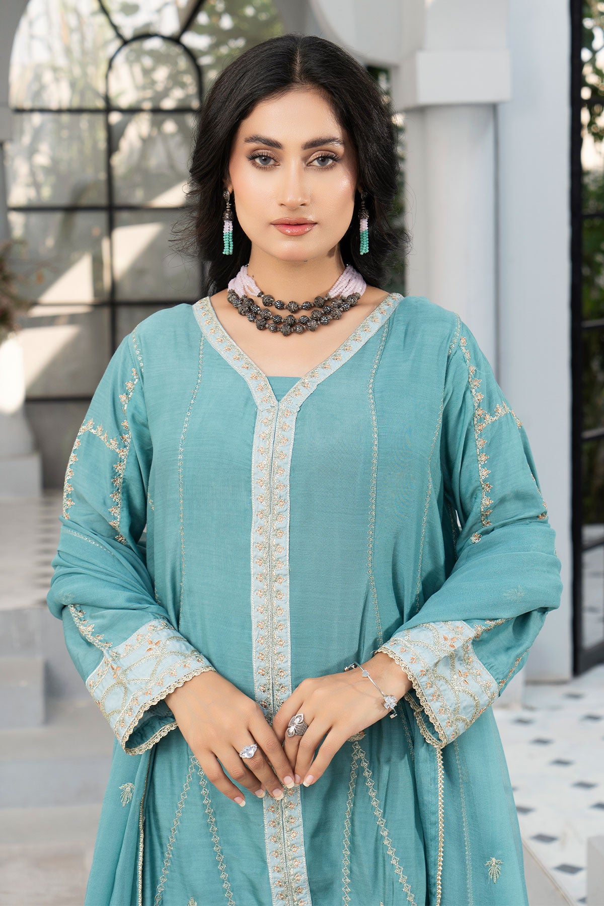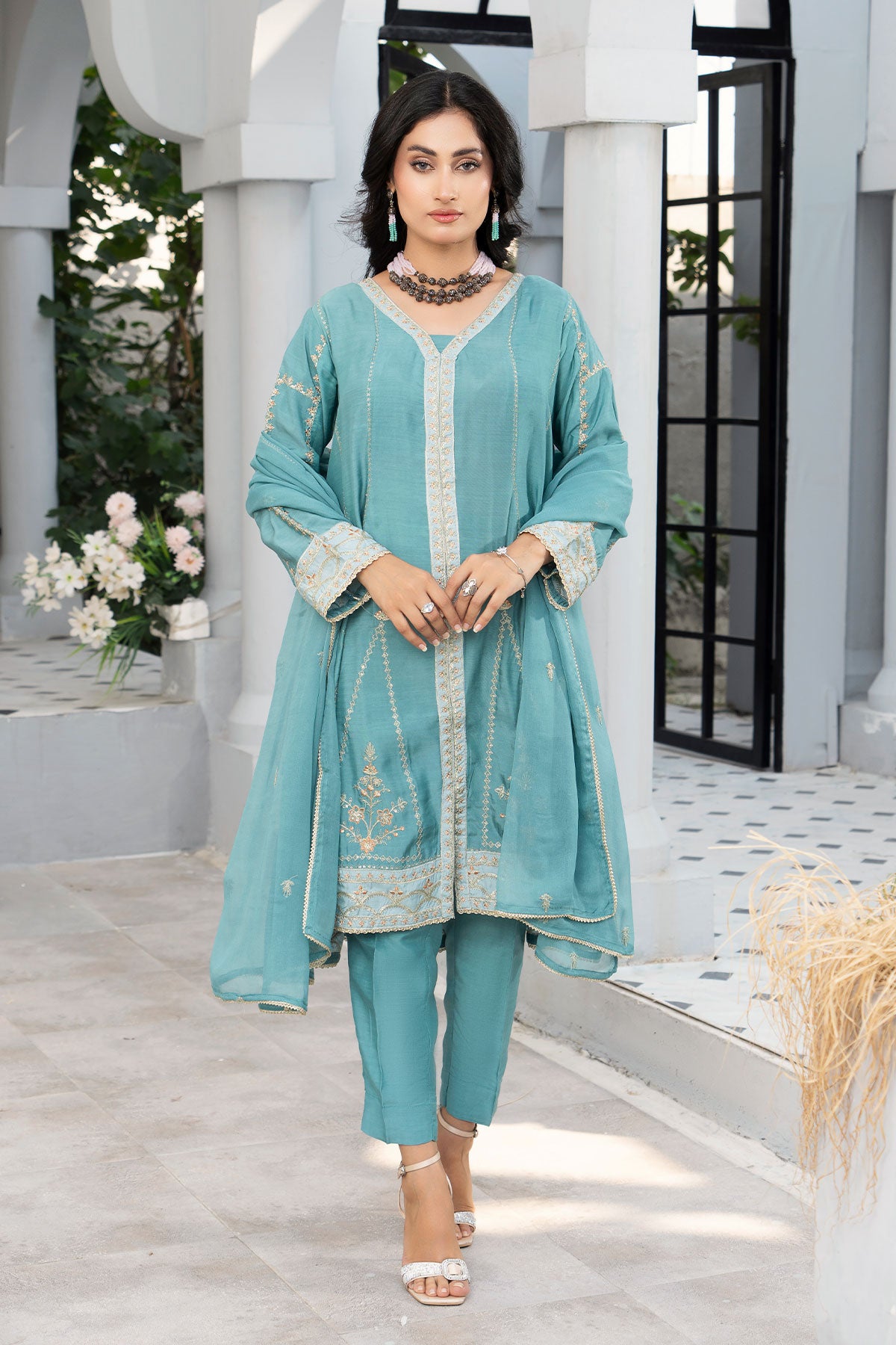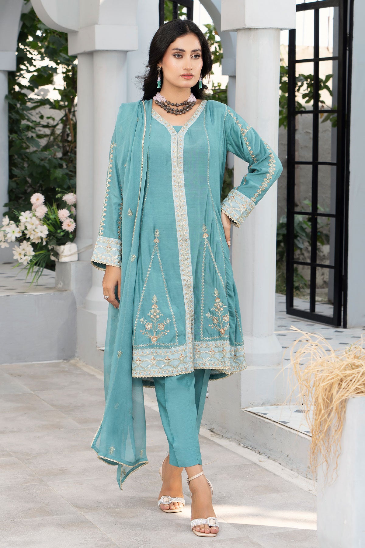 Elevate your style! This a line frock features intricately embroidered front and back on soft viscose with matching embroidered sleeves. Complete your ensemble with a plain viscose trouser and a delicate embroidered chiffon dupatta. Enjoy the effortless elegance and convenience of a ready-to-wear outfit.