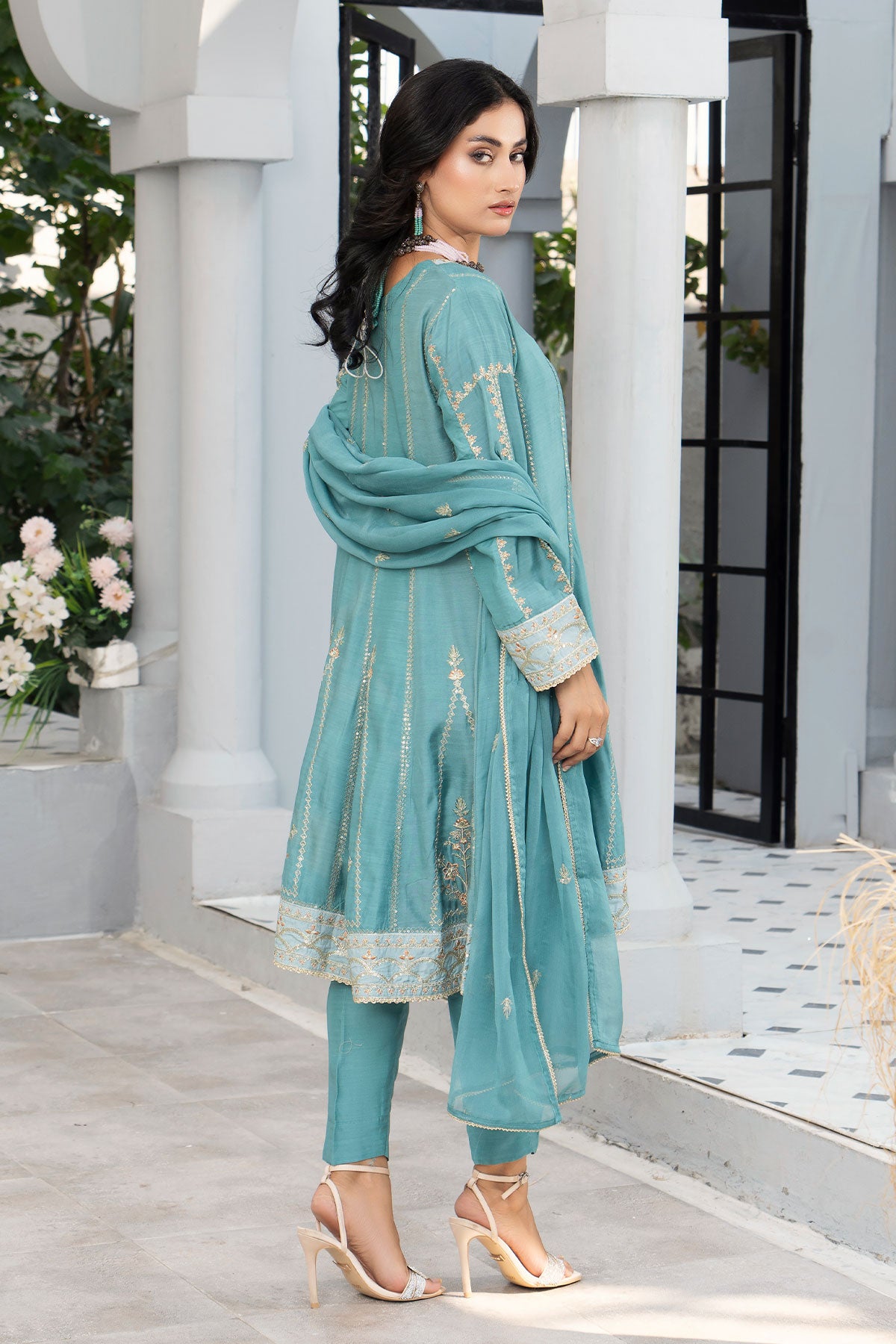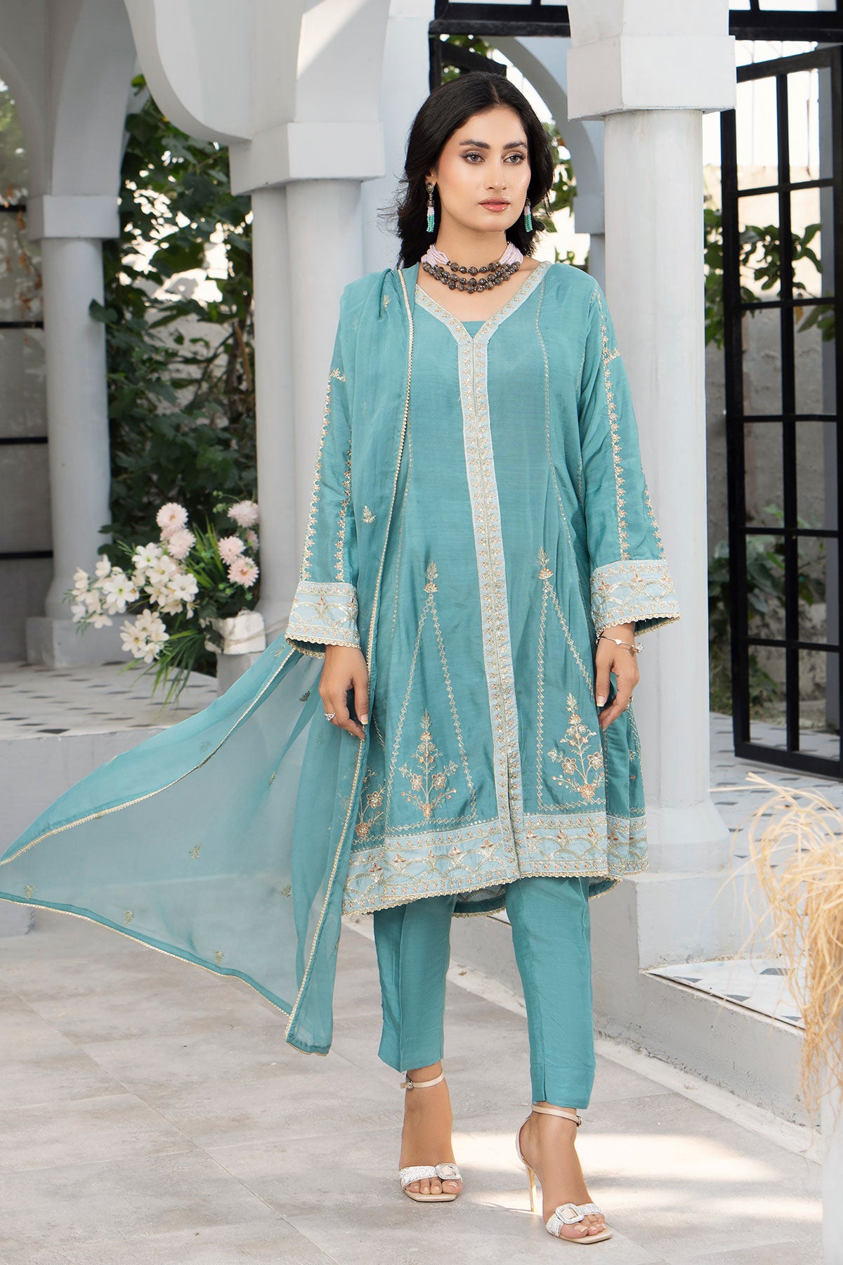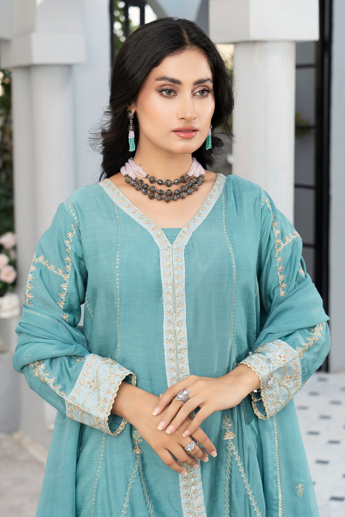 Elevate your style! This a line frock features intricately embroidered front and back on soft viscose with matching embroidered sleeves. Complete your ensemble with a plain viscose trouser and a delicate embroidered chiffon dupatta. Enjoy the effortless elegance and convenience of a ready-to-wear outfit.